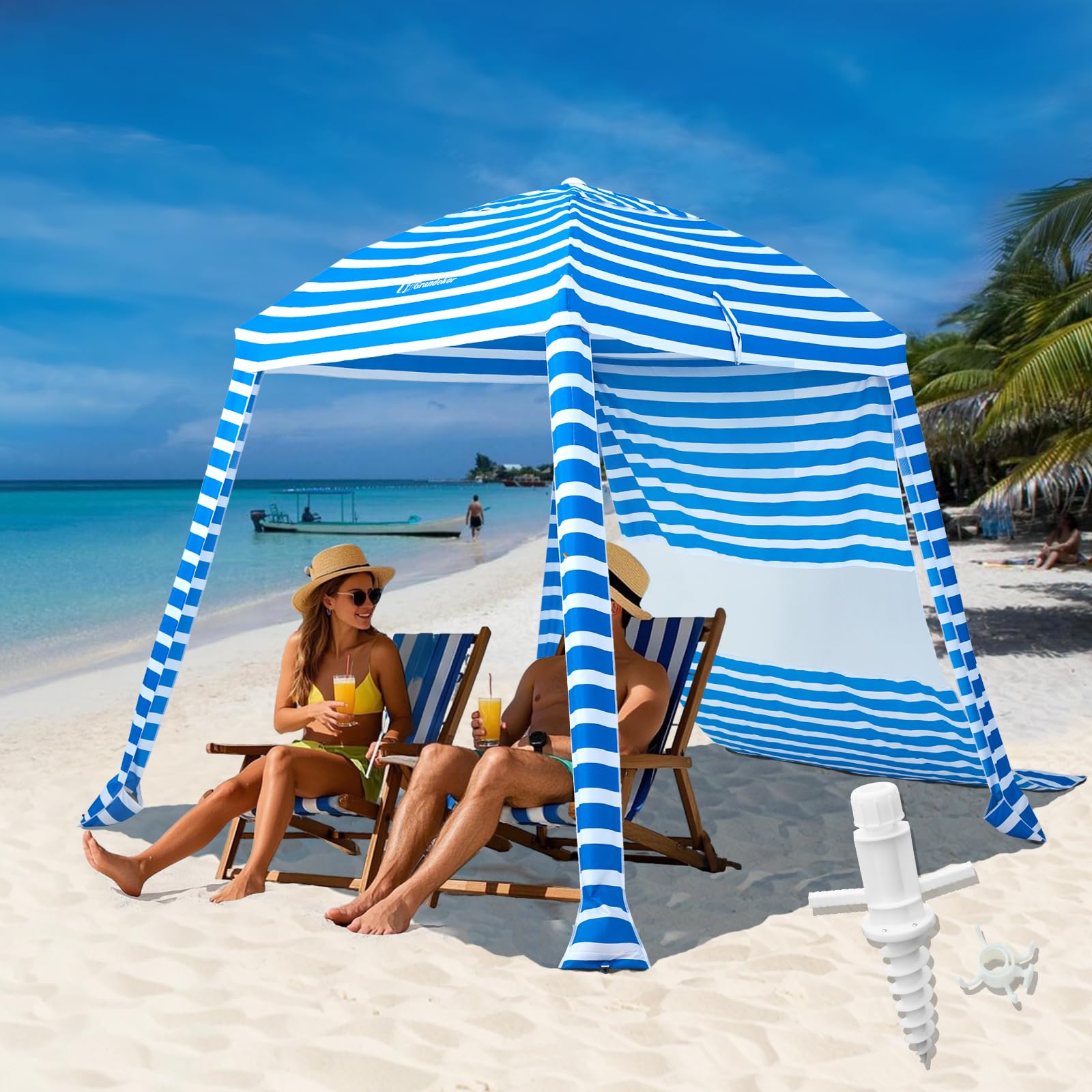Grandekor Upgraded 6'×6' Pop Up Beach Canopy Tent for Family & Kids UPF 50+ Sun Shelter for Pool Camping with Sand Anchor Sidewall Bold Blue White Stripe