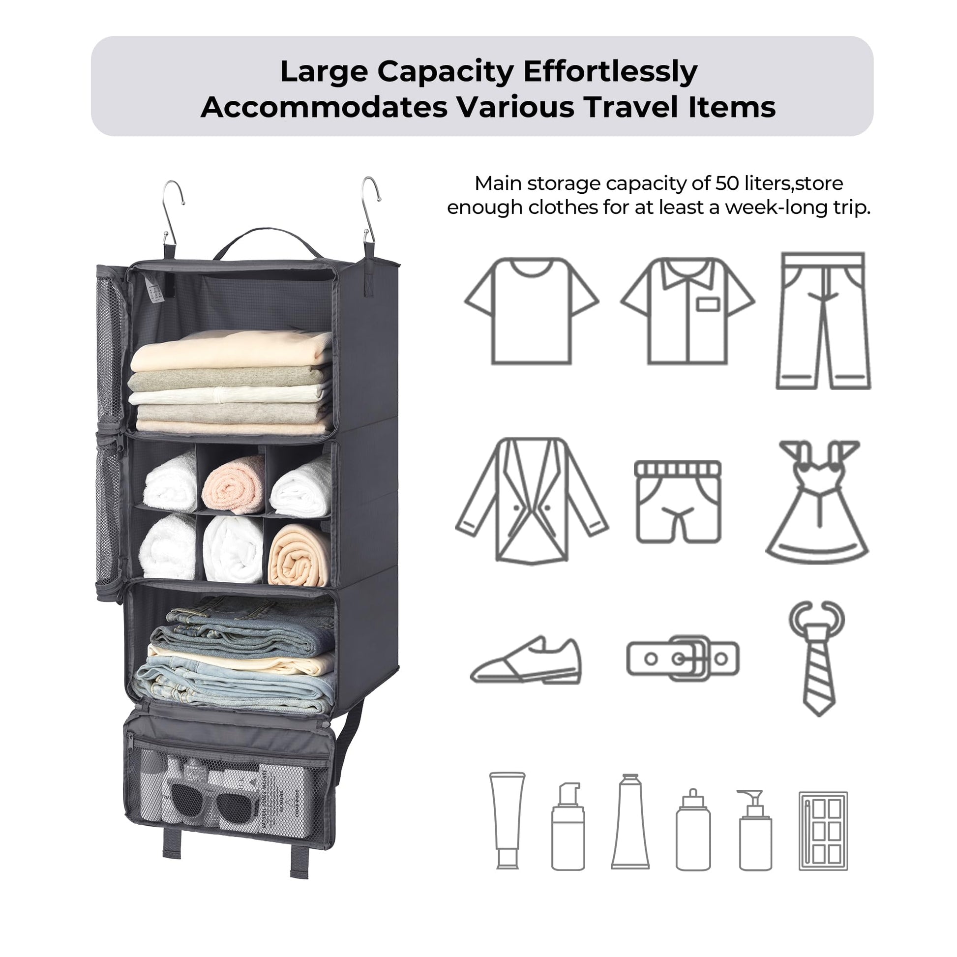 • Easy to Access: Designed with mesh windows, it allows you to quickly visually identify your clothing and accessories while traveling. Don't waste time unpacking. Just hang them on the closet rod with the 2 sturdy hooks, and you are ready to go.
