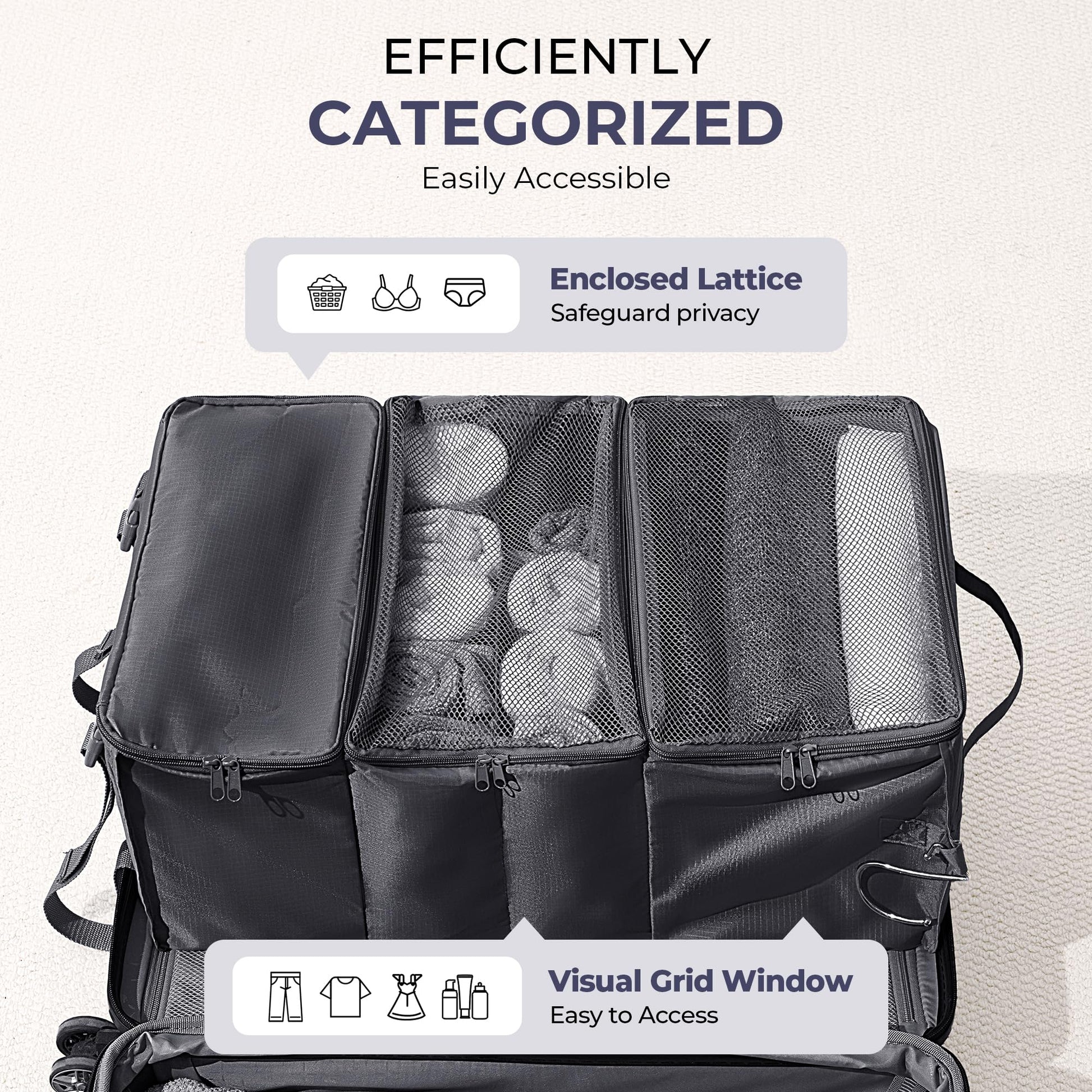 • Diverse Storage Cube: Our 3 shelf travel packing organizers offers diverse storage options, the middle tier have 6 small compartments for categorizing items, the zippered bottom compartment can be used to store dirty clothes, keeping other clothes clean.
