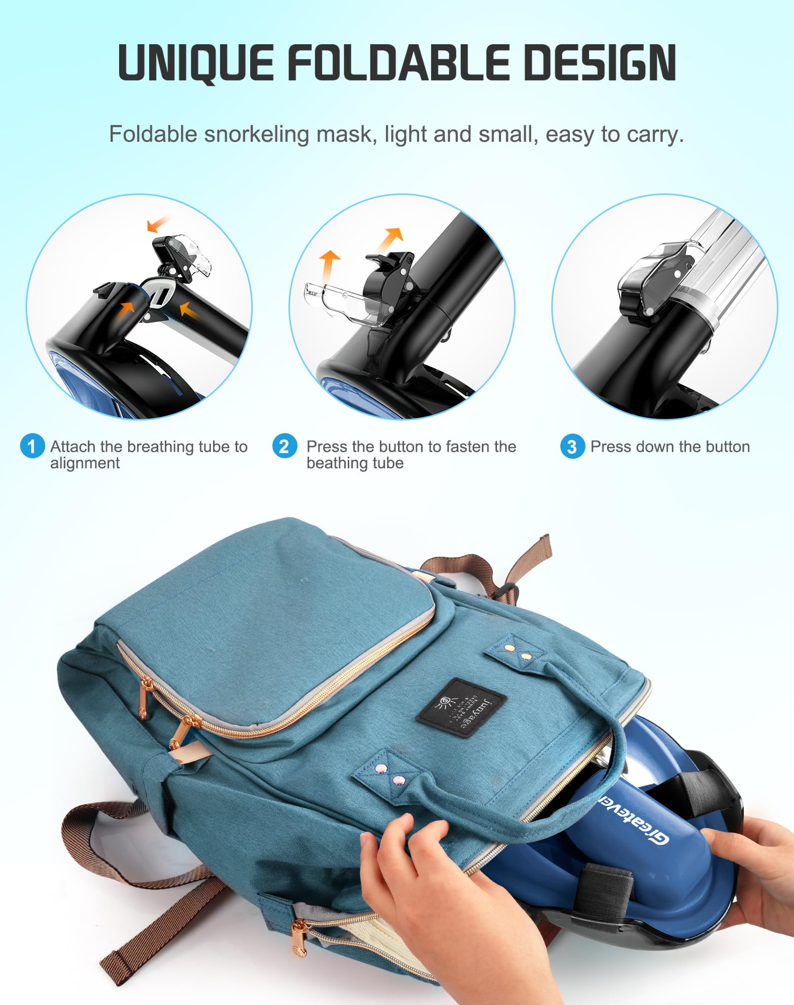 • Premium Enhanced Functions: This snorkel mask set is equipped with a removable camera mount that allows you to install your camera and record your wonderful underwater snorkels adventures, while using a unique foldable design that is easy to carry and space-saving, making it the perfect choice for beach vacation!