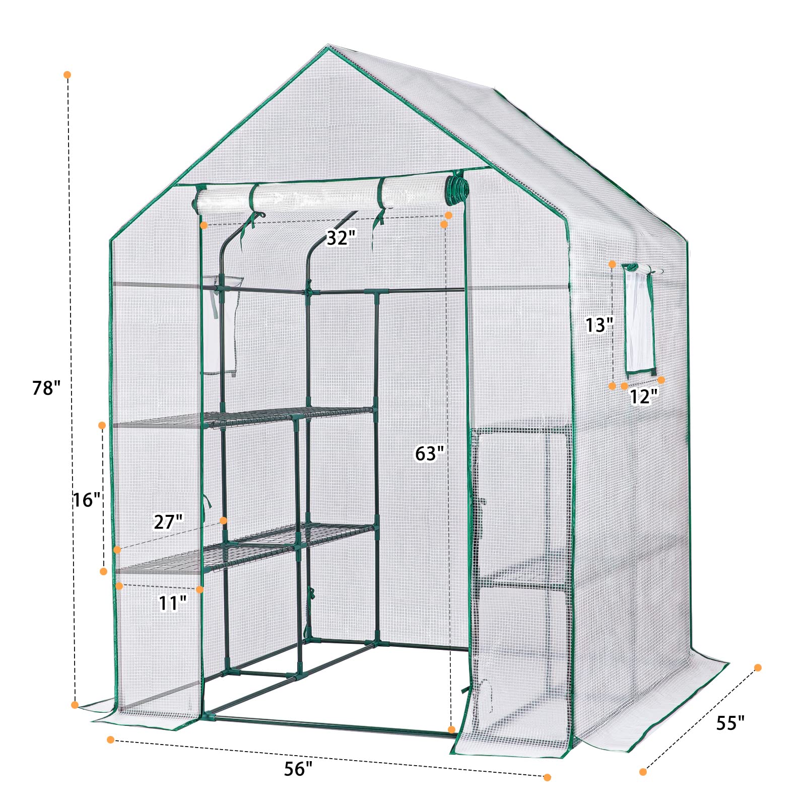 • Walkin Greenhouse: 56'(L)*55'(w)*78'(H)outdoor walk greenhouse is convenient to enter and exit to take care of plants. For example, watering and fertilizing, etc.
