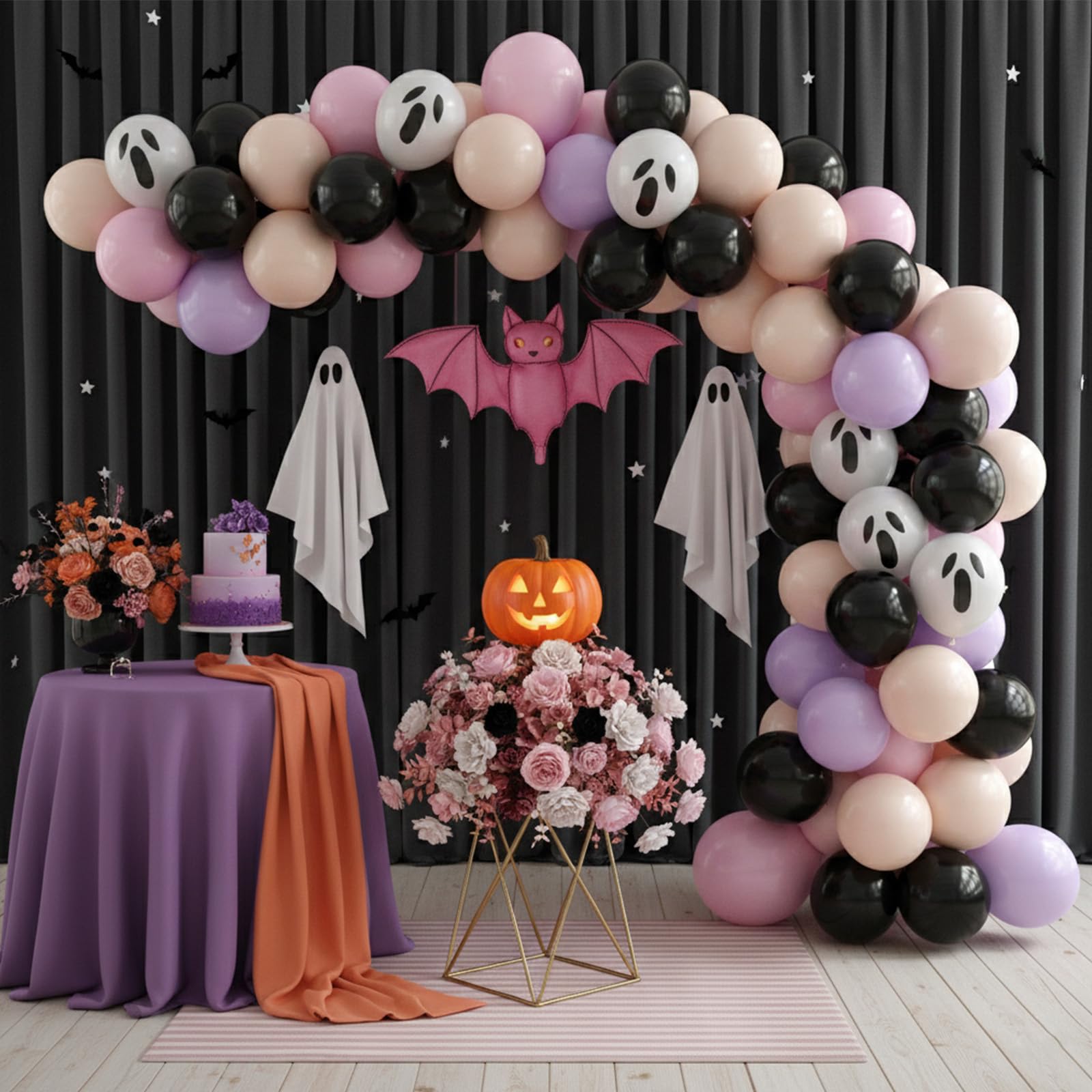 Halloween Balloons,52PCS 12 Inch Halloween Pastel Pink Black Orange Purple Balloon, Ghost Printed Ballons for Halloweenday BOO Party Decorations,Birthday,Baby Shower