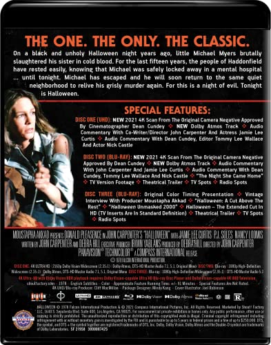 DISC ONE (4K UHD): NEW 2021 4K Scan From The Original Negative, Approved By Cinematographer Dean Cundey NEW Dolby Atmos Track Audio Commentary With Co-Writer/Director John Carpenter And Actress Jamie Lee Curtis Audio Commentary With Director Of Photography Dean Cundey, Editor Tommy Lee Wallace, And Actor Nick Castle