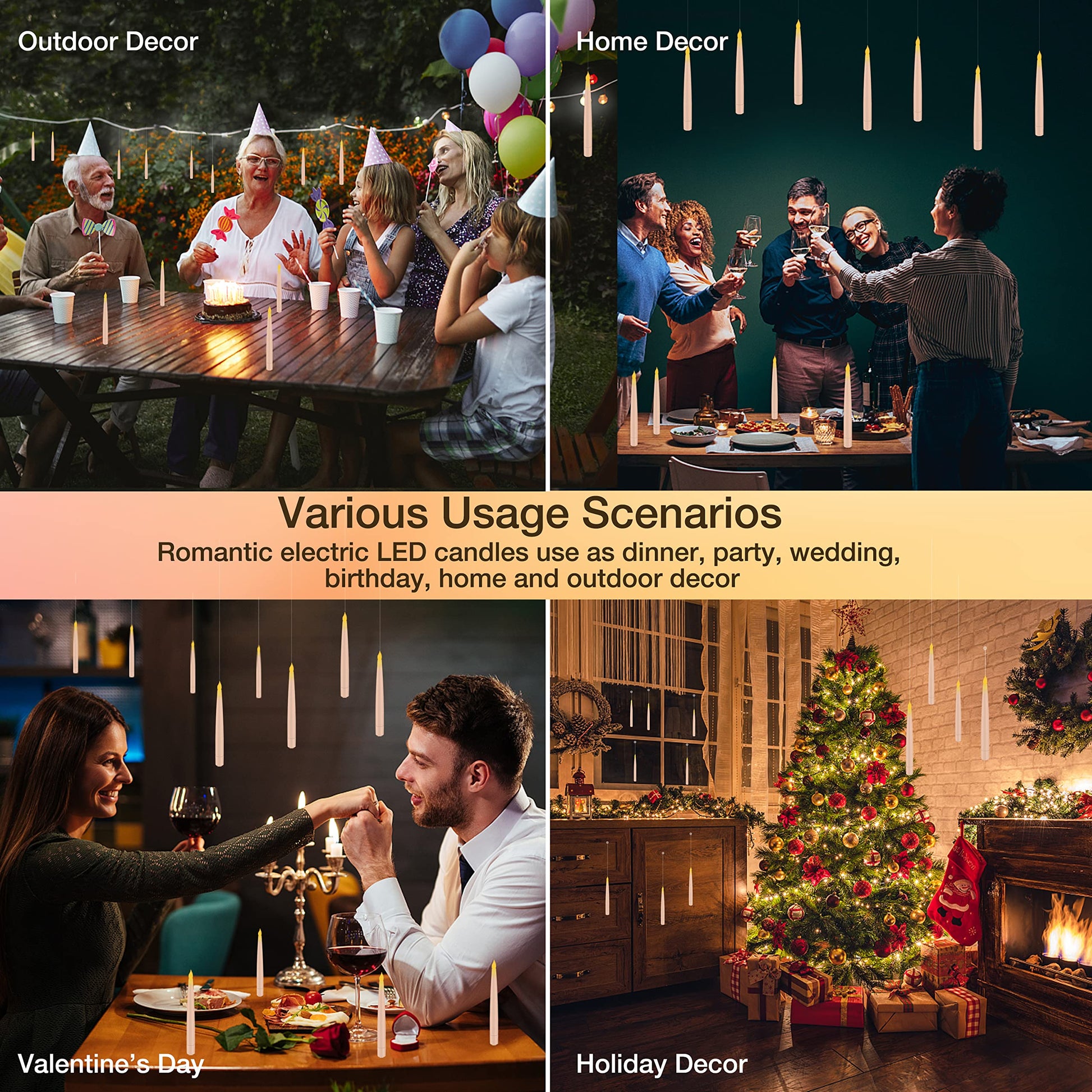 • Hanging candles for Magic Decorations : This set of floating candles are equipped with 4.9ft fishing line(barely visible) . You can insert these hanging candles into the ceiling with pushpin or fix these electric candles on the window, wall or cabinet, perfect room decor for holiday decorations, church services, window candles, the fireplace, table, home & outdoor decoration.