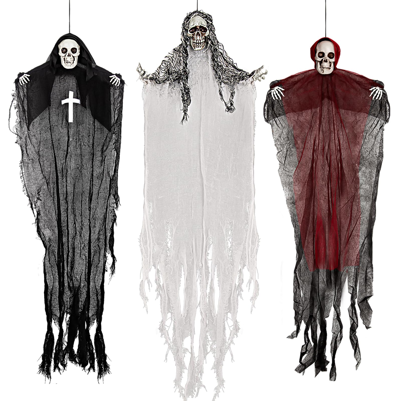 Halloween Hanging Skeleton Ghosts (3 Pack), One 36” and Two 32” Halloweens Grim Reapers, Flying Ghosts for Haunted House Prop Décor, Indoor/Outdoor Halloween Decorations