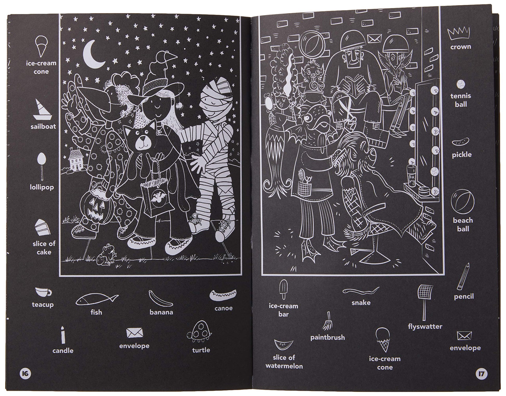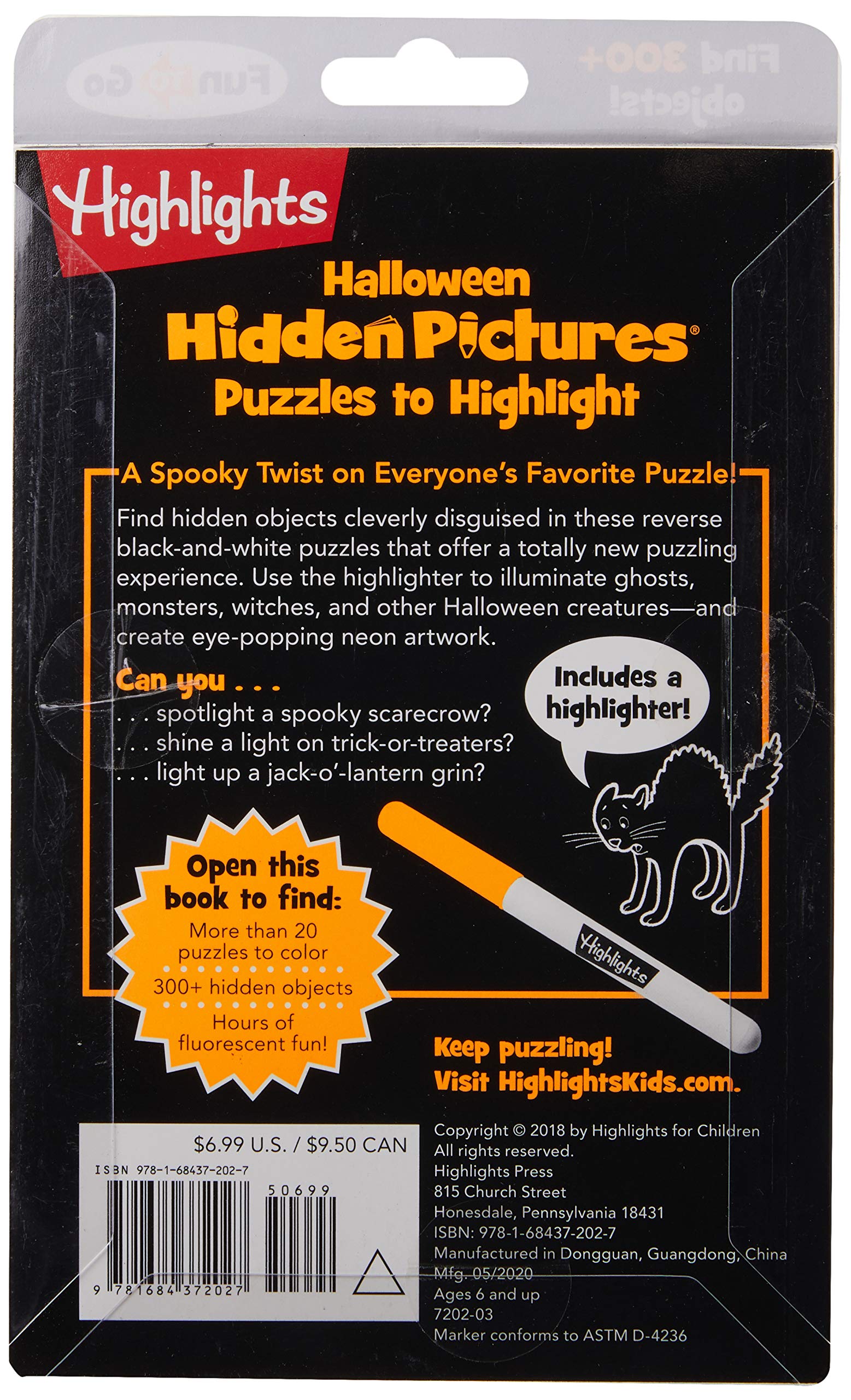 Details: Pumpkins, scarecrows, monsters, and other spooky creatures pop out in this Halloween twist on everyone's favorite Hidden Pictures puzzles. Kids ages 6 and up can use the included orange highlighter to create glowing neon scenes and illuminate the cleverly hidden objects in these challenging white-on-black puzzles from Highlights.