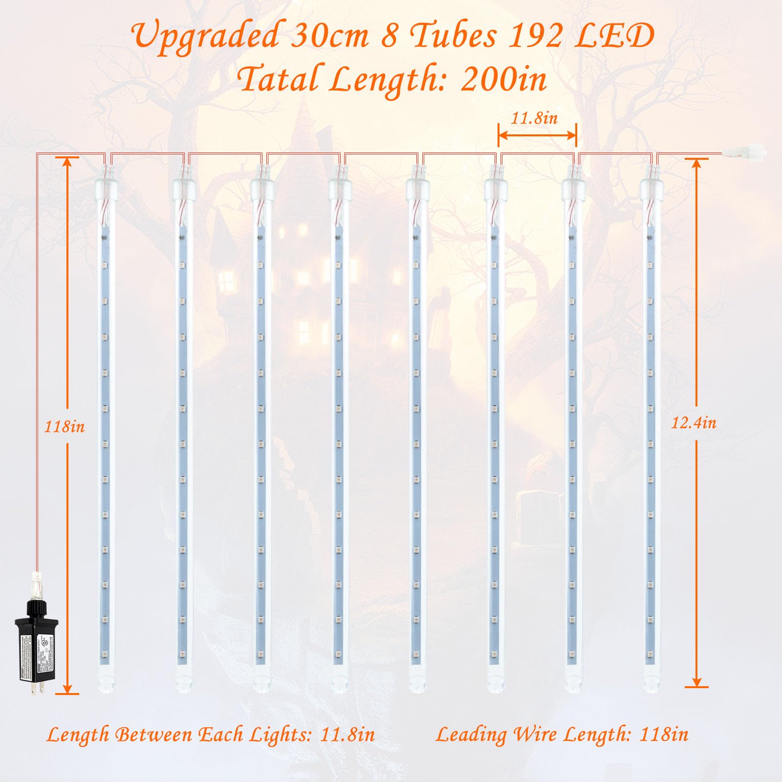 • Halloween Meteor Shower Lights: Each package contains 2 connectable Halloween lights outdoors. Each set includes 8 tubes with 192 LEDs, resulting in a total of 16 tubes and 384 LEDs per package. The double-sided LEDs within the tubes ensure omnidirectional illumination