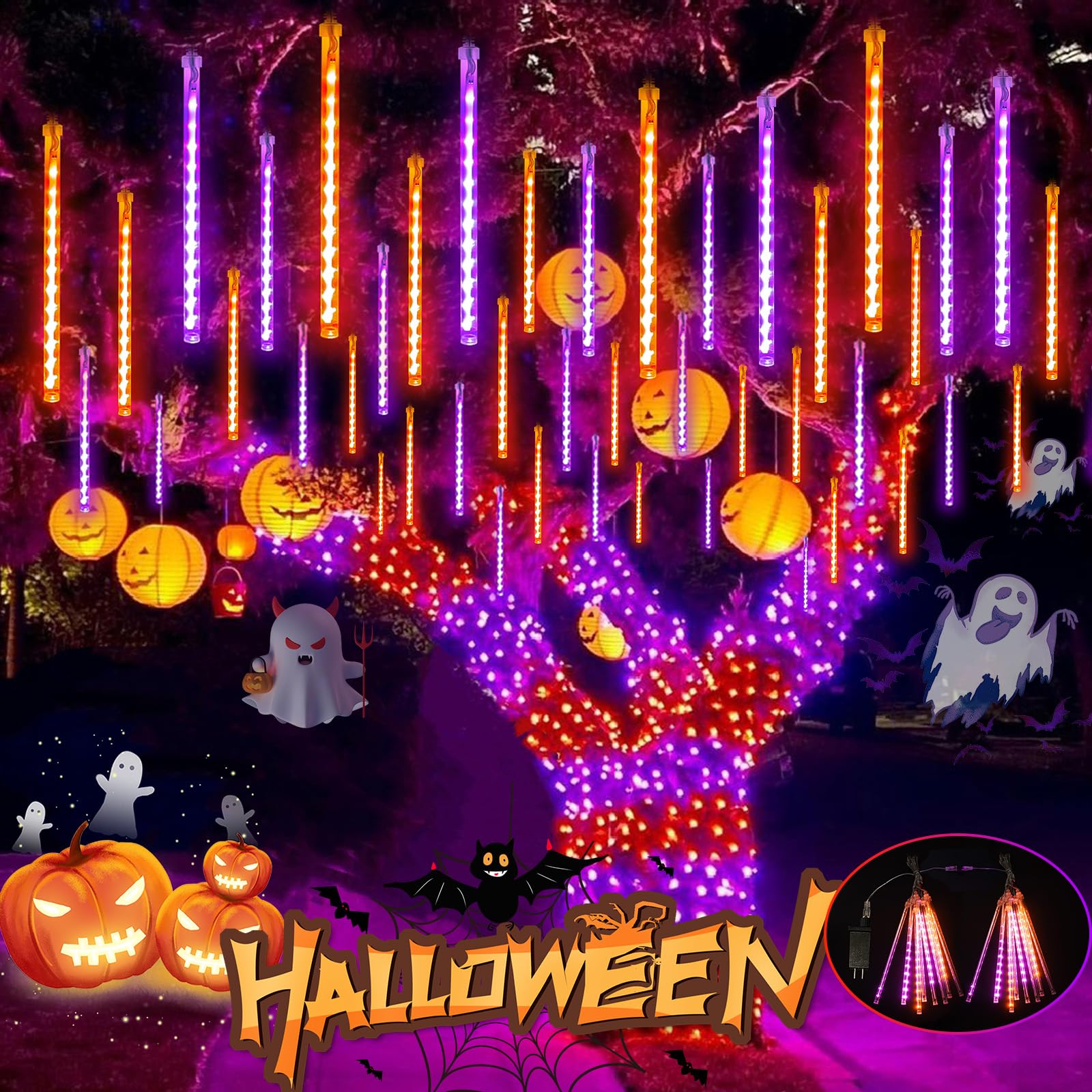 Halloween Lights Outdoor, 2 Pack Extendable Meteor Shower Lights Outdoor Waterproof with Timer, Total 384 LED 30cm 16 Tubes Cascading String Light Plug in for Halloween Yard Party (Orange and Purple)