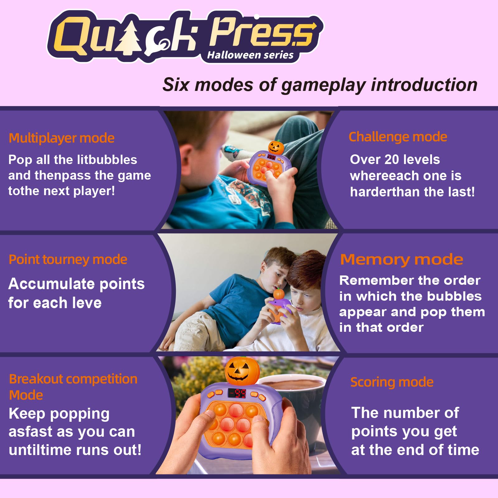 • Upgraded Halloween Gifts for Kids: Looking for a captivating toy gift for kids? Get ready for endless hours of fun with this pop fidget toy ! With multi modes, this handheld fidget toy is perfect for all ages.Simply install then lights up dancing bubble at now!Addictive classic press bubble game meets fast electronic game!