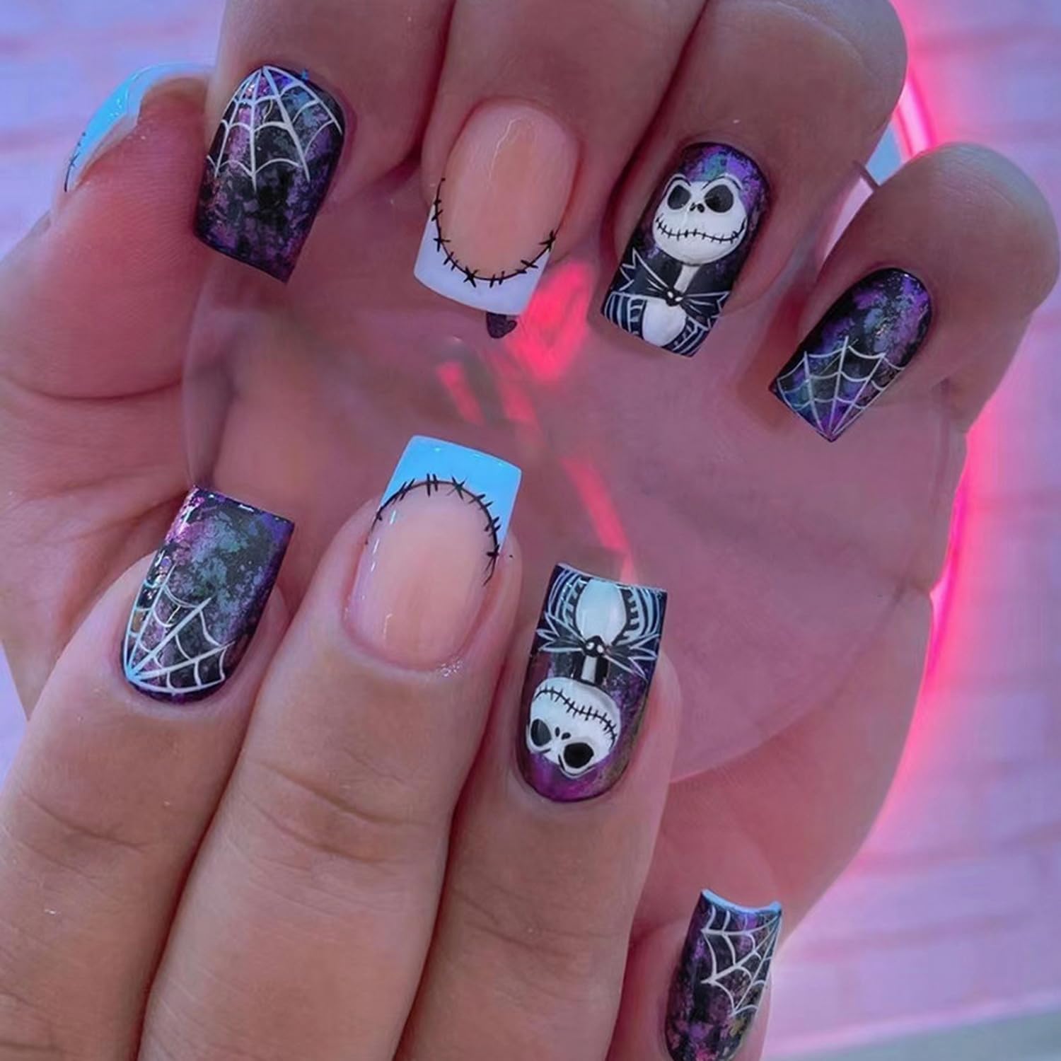 Halloween Press on Nails Medium Square Fake Nails with Spider Web Design Acrylic Nails Nightmare Before Christmas Nails Scary Stick on Nails Holiday French Tip Artificial Nails for Women 24Pcs