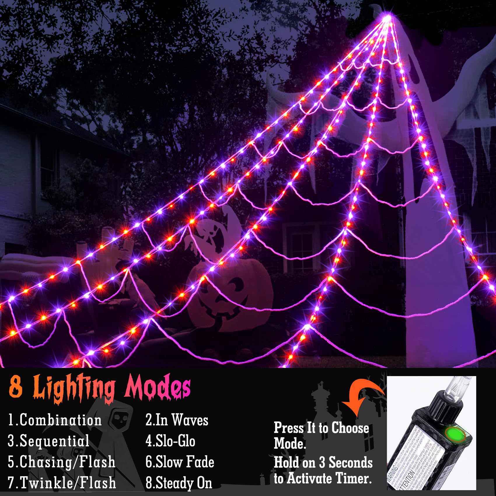 • 8 Lighting Modes: The Halloween spider web lights have 8 different light patterns, which is perfect for creating a festive atmosphere: Combination, In Waves, Sequential, Slo Glo, Chasing/Flash, Slow Fade, Twinkle/Flash, Steady On. You can easily set up the lighting modes through pressing the round button on the adapter to light up a spooky and funky holiday atmosphere for your Halloween decorations.
