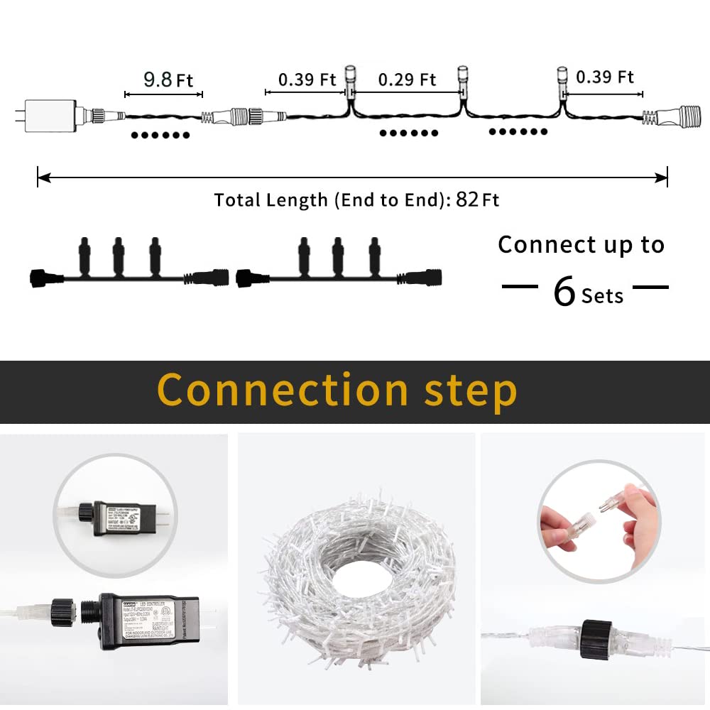 • End To End Expandable String Lights --- Female plug at the end is connectable for more than one string, which makes you can connect max 6 sets together. Each one length is 25m/82ft, the max expandable length is 150m/490 ft. Flexible usage in different scences.