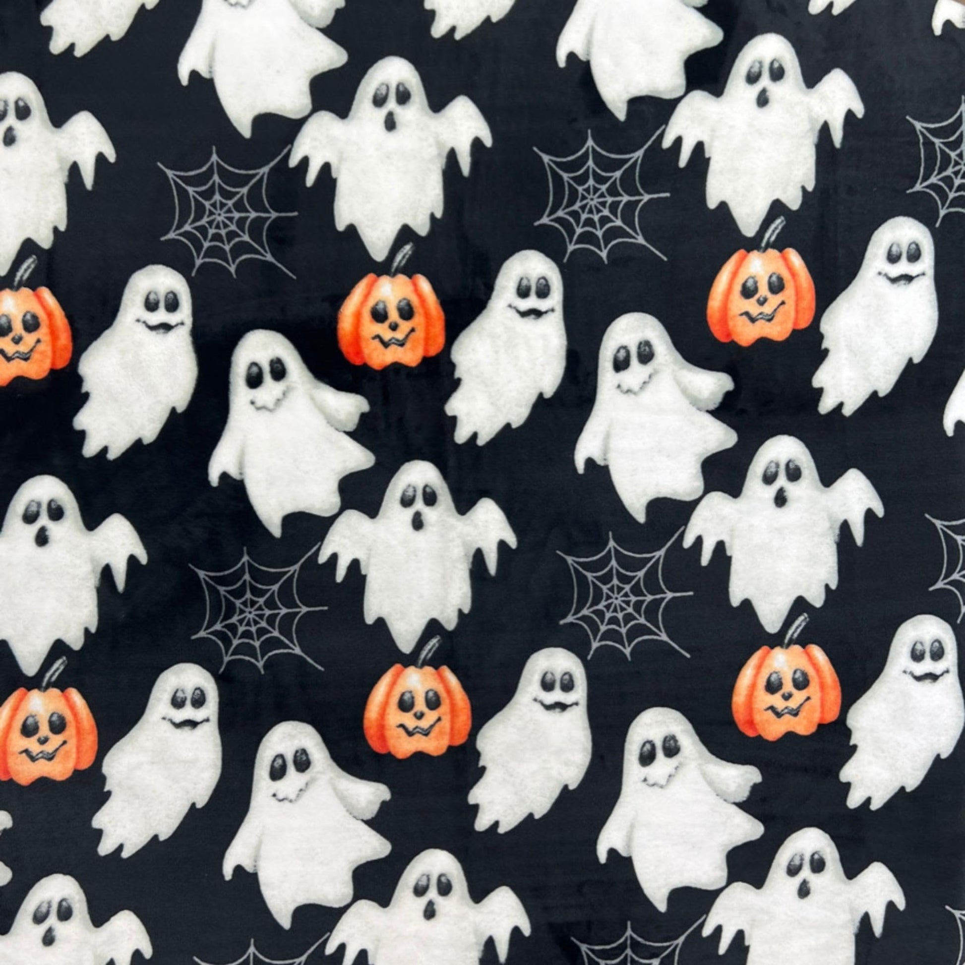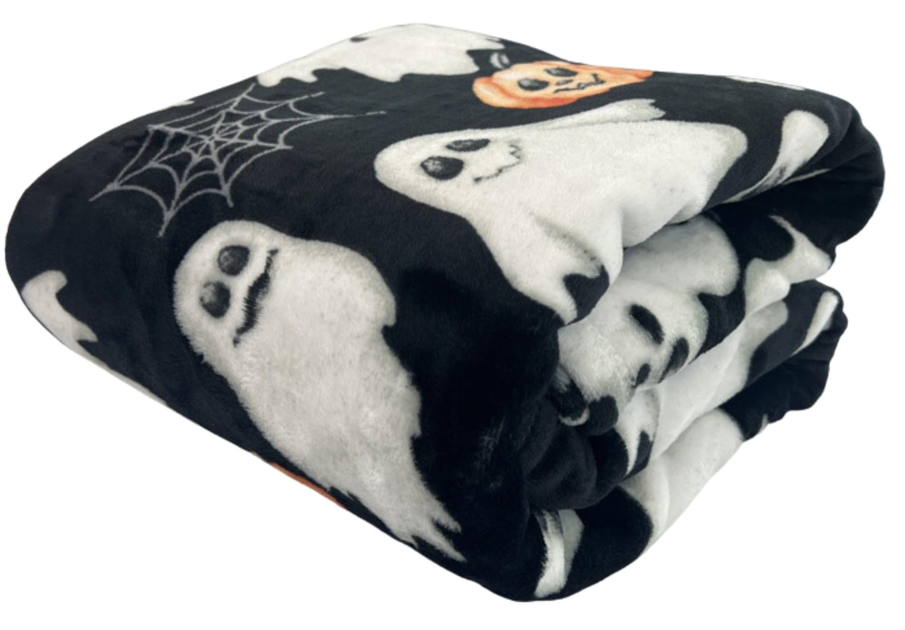 Halloween Throw Blanket: Jack O Lantern Pumpkins White Ghosts and Spiderwebs on Soft Black Velvet Fleece for Sofa, Couch, Chairs and Bed