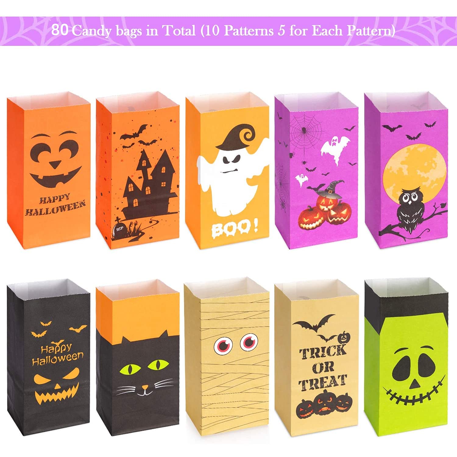 • 80 Trick-or-Treat Bags - Coming in 10 different kooky kid-friendly designs, 8 pcs for each Halloween pattern. This set of 80 Halloween treats bags is ideal for Halloween goody bags or party favors.