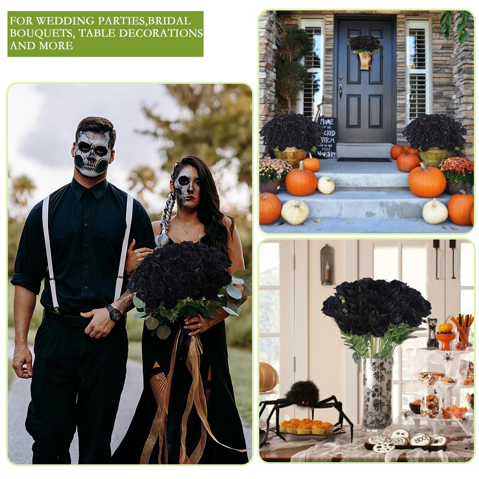 Hananona 50 Pcs Artificial Roses in Bulk, Fake Velvet Silk Roses Realistic Black Roses for Wedding Centerpieces Flower Arrangement Home Decor (50, Black)