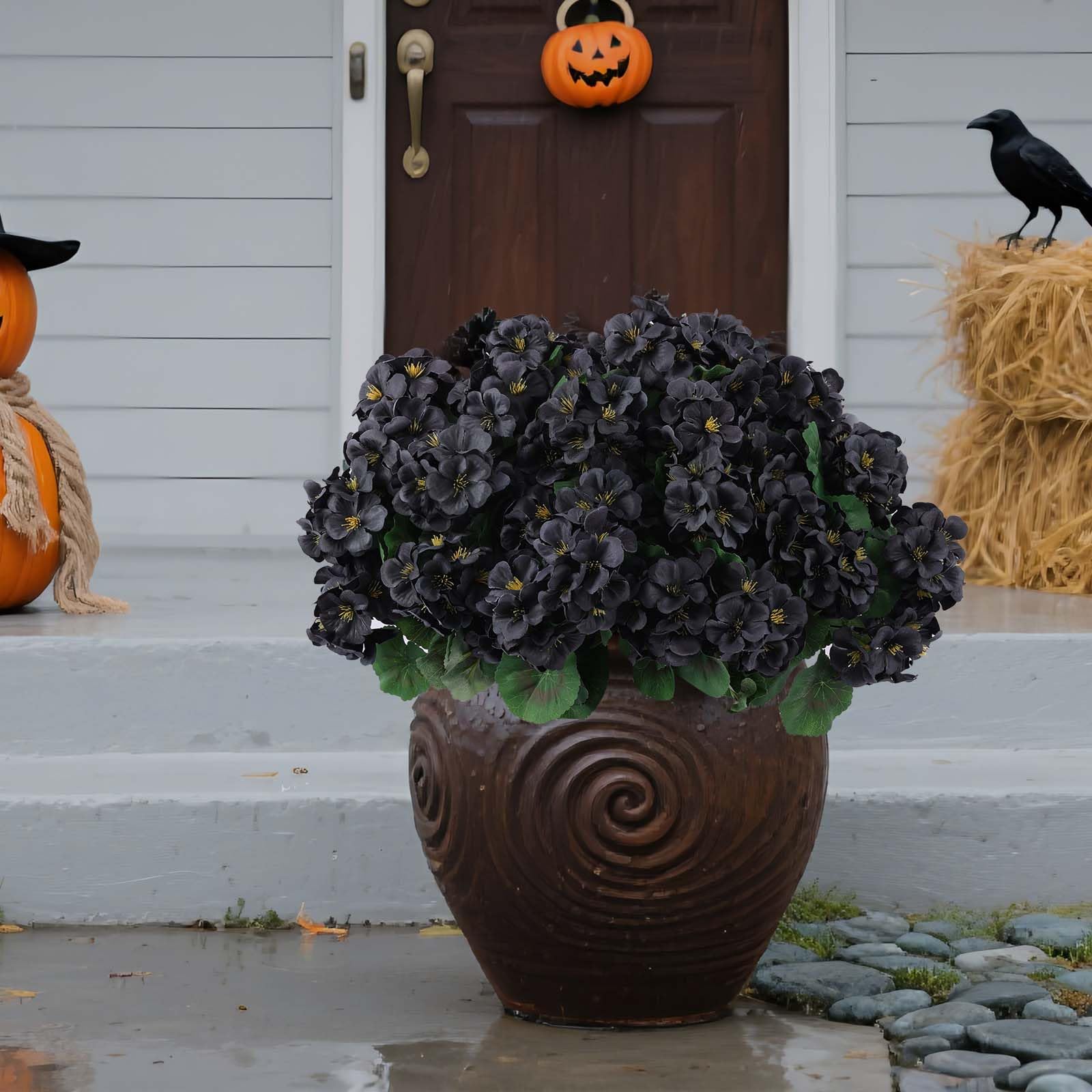 Hananona 6 Bundles Artificial Geranium Flowers for Outdoors Black Silk Geranium Flowers Outdoor UV Resistant Plants Faux Black Flower for Home Kitchen Halloween Table Centerpieces Decor (6, Black)
