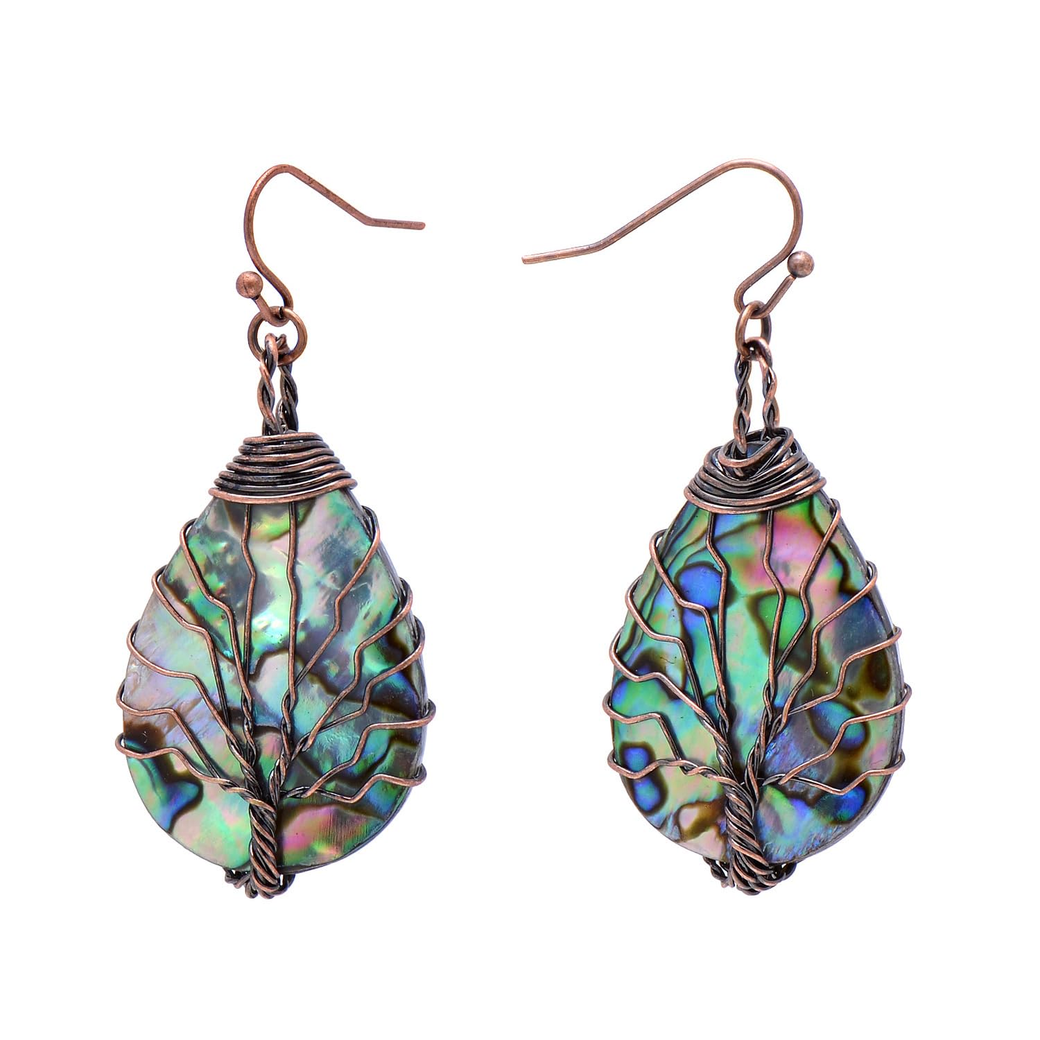 Handmade Teardrop Abalone Shell Dangle Earrings for Women, Wire Craft Tree of Life Earrings