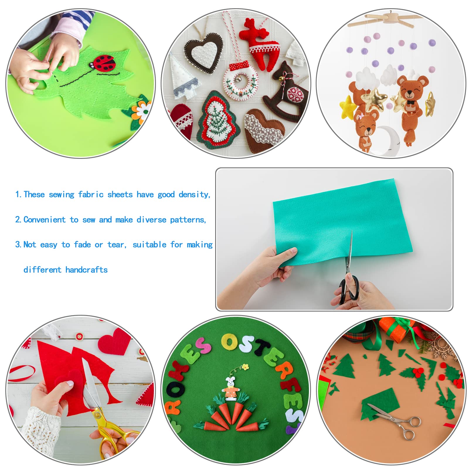 • 【Easy to Sew & Cut & Glue & Stap】High-quality felt sheets for crafts easy to cut endure sewing, cutting, stapling, folding, and ironing. thick felt sheets are in soft texture with a stiffened structure, Easy to cut, fold, glue, sew and staple - even to paint and draw on.and hold the shape perfectly with less deformation or tear.