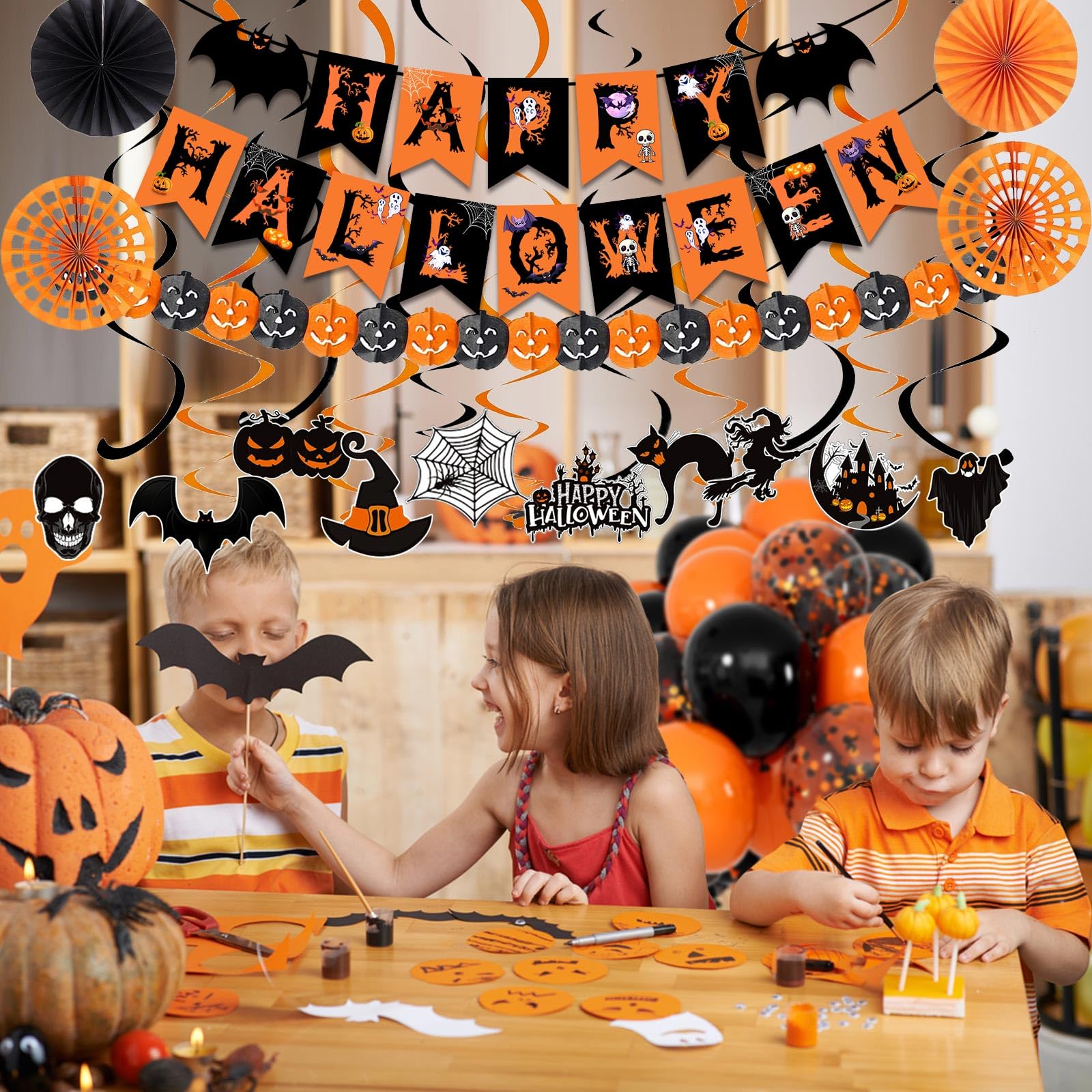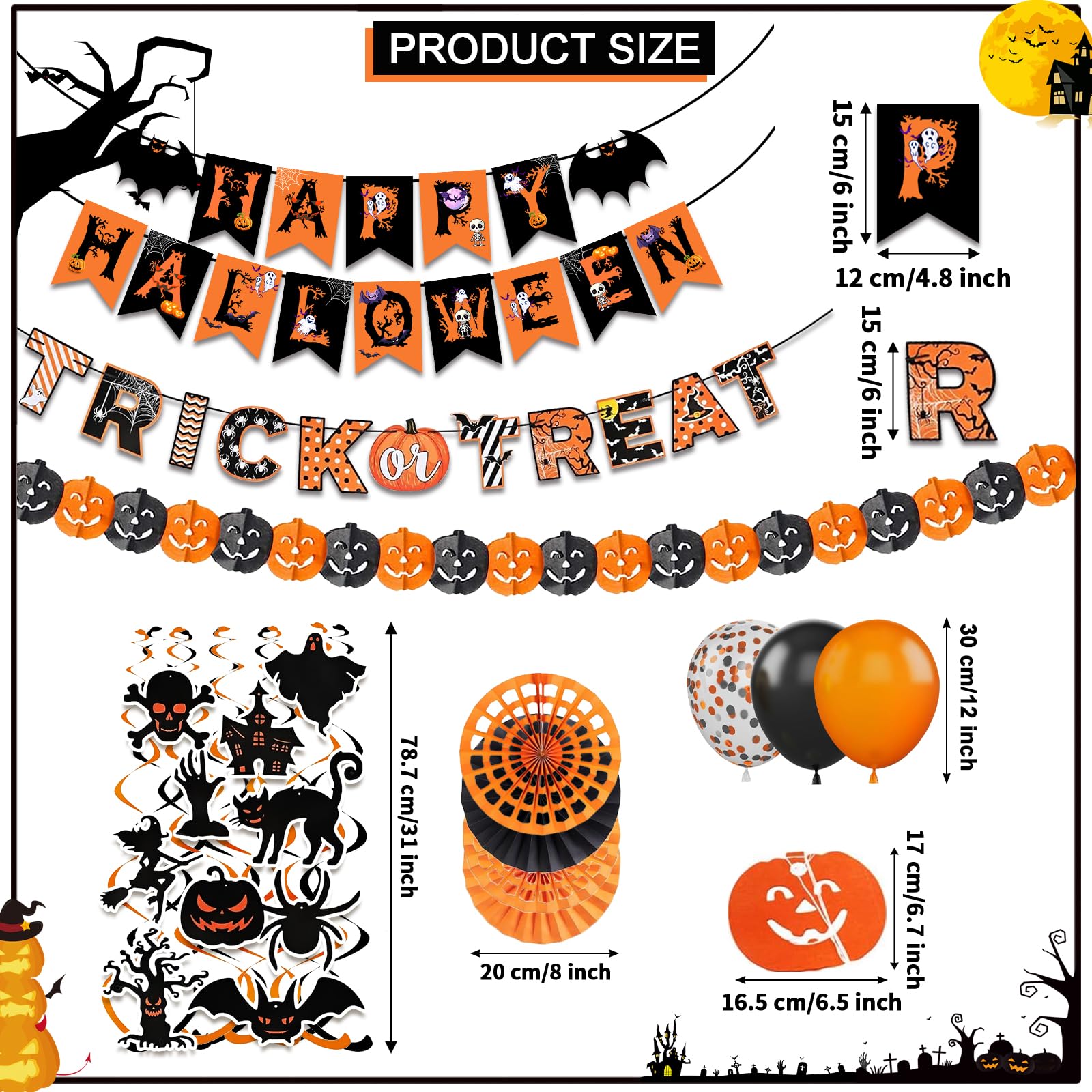 Happy Halloween Trick or Treat Banner Paper Fan Balloons & Swirl Streamers Goul Bat Cat Bird Ghost Pumpkin Lantern for Party Decorations