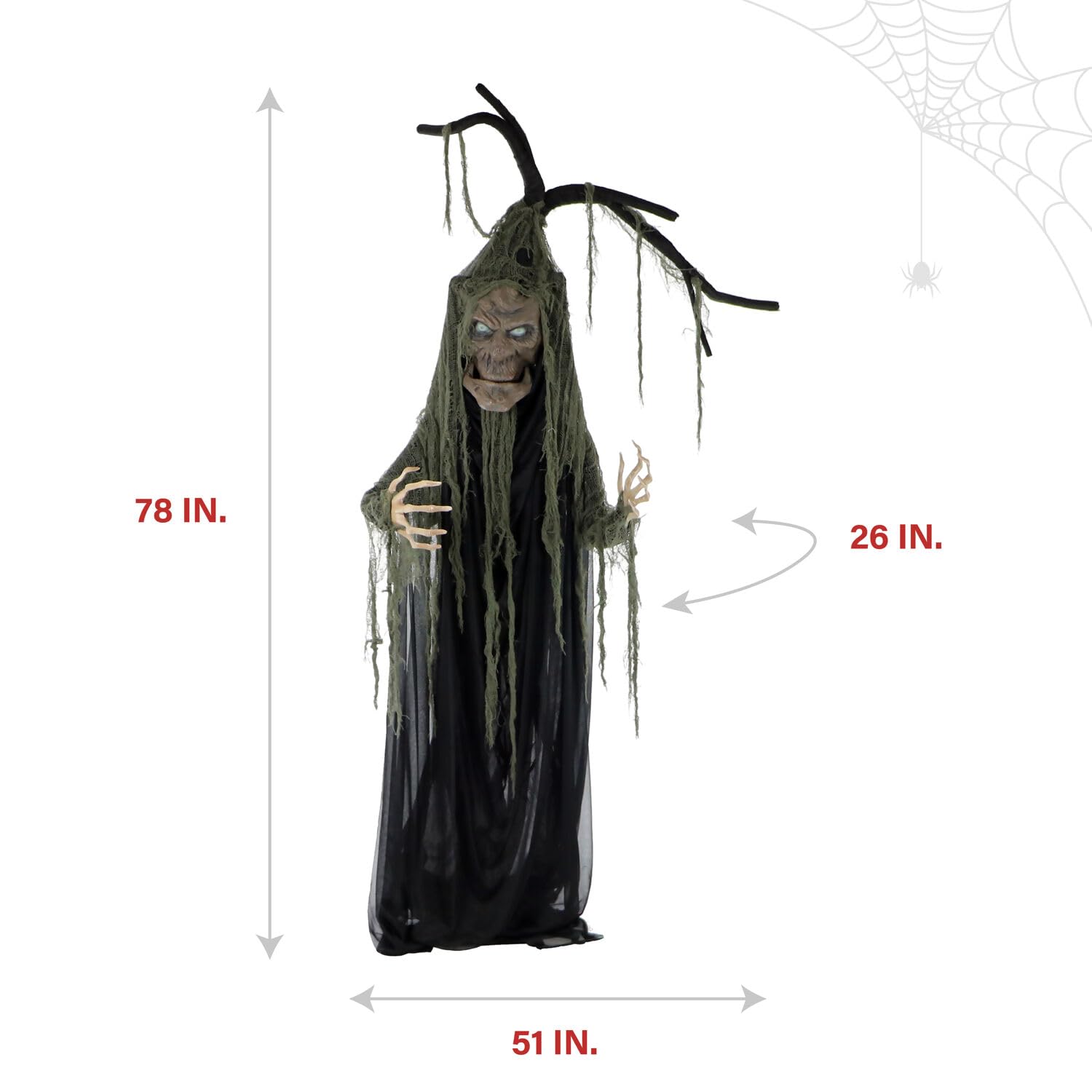 Details: Enter, if you dare, into the horrifying world of Haunted Hill Farm. Our life-size, creepy creatures are just what you need to turn your home into the scariest haunted house on the block. Our wide choice of monsters, each more nerve-wracking than the last, is sure to create a hair-raising cast for the creepiest display you can imagine. 'Ahhh, yet another creature of the night approaches.' It's Leafless Lenny, our Talking Tree Man with a mouth that moves and eyes that flash as he speaks. With a scary tree face and long twig fingers, he'll greet your guests with a sinister voice that will startle even the most stoic visitors. 'Have you come for a treat or a trick? Muahahaha!' Battery operated with poseable arms, he includes a stand and an optional hanging loop at the top of his head so you can display him however and wherever you want. For longer prop life, we recommend indoor or sheltered outdoor use protected from inclement weather. Choose this haunted tree to display near the front door, on your covered porch, at the office, or inside your home to scare your family, friends, neighbors, and trick-or-treaters.
