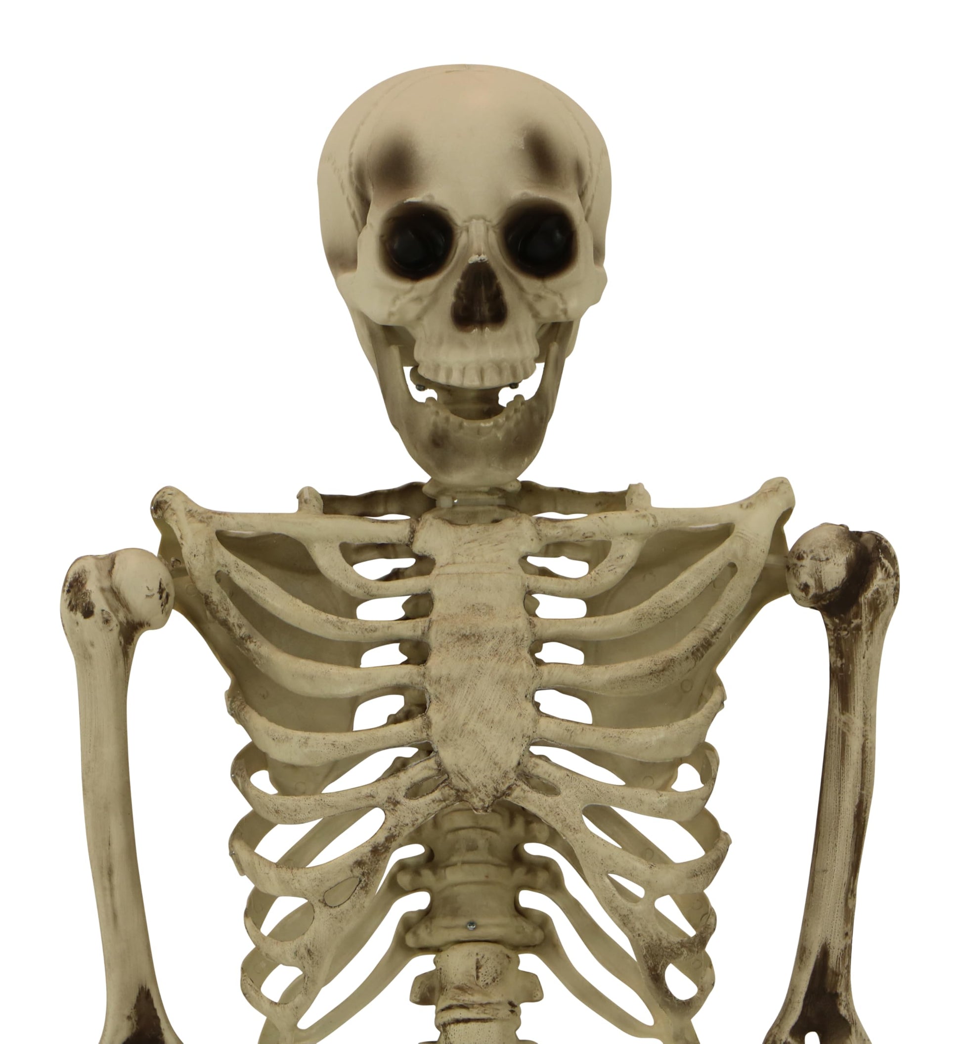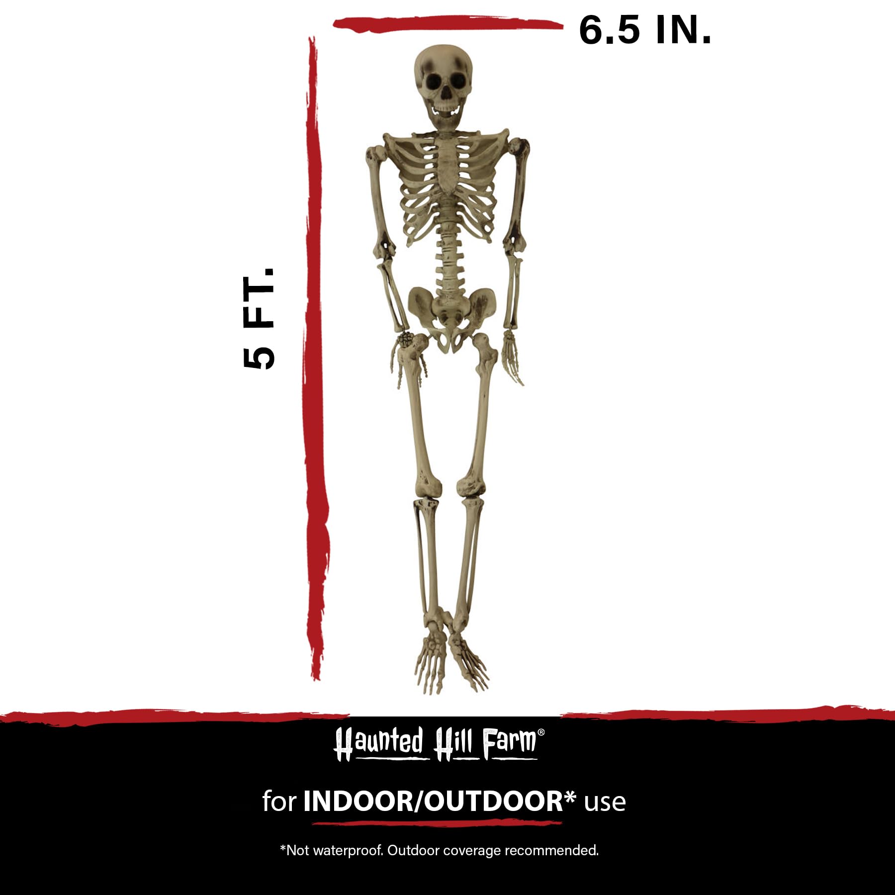 Details: Be very afraid of Haunted Hill Farm's collection of spooky props. These blood-curdling creatures are sure to terrify any trick-or-treaters, coworkers, or customers. This skeleton's life-sized body will terrify visitors with its sharp skeleton hands and hollow-eyed skull. His arms bend into various petrifying poses for endless scare possibilities. Place his dirtied, lean figure on your lawn to give him the appearance of emerging from the grave or hang him above your bowl of holiday treats. Only the bravest of guests will dare approach this sinister skeleton. Place him on the front porch to greet visitors or in your living room to complement the rest of your spooky decor. For longer prop life, we recommend indoor or sheltered outdoor use protected from inclement weather. A 1 year warranty is also included so you have peace of mind while celebrating all season long. For thrills and chills so frightening that your neighbors will run shrieking in horrendous delight, count on Halloween decorations from Haunted Hill Farm.