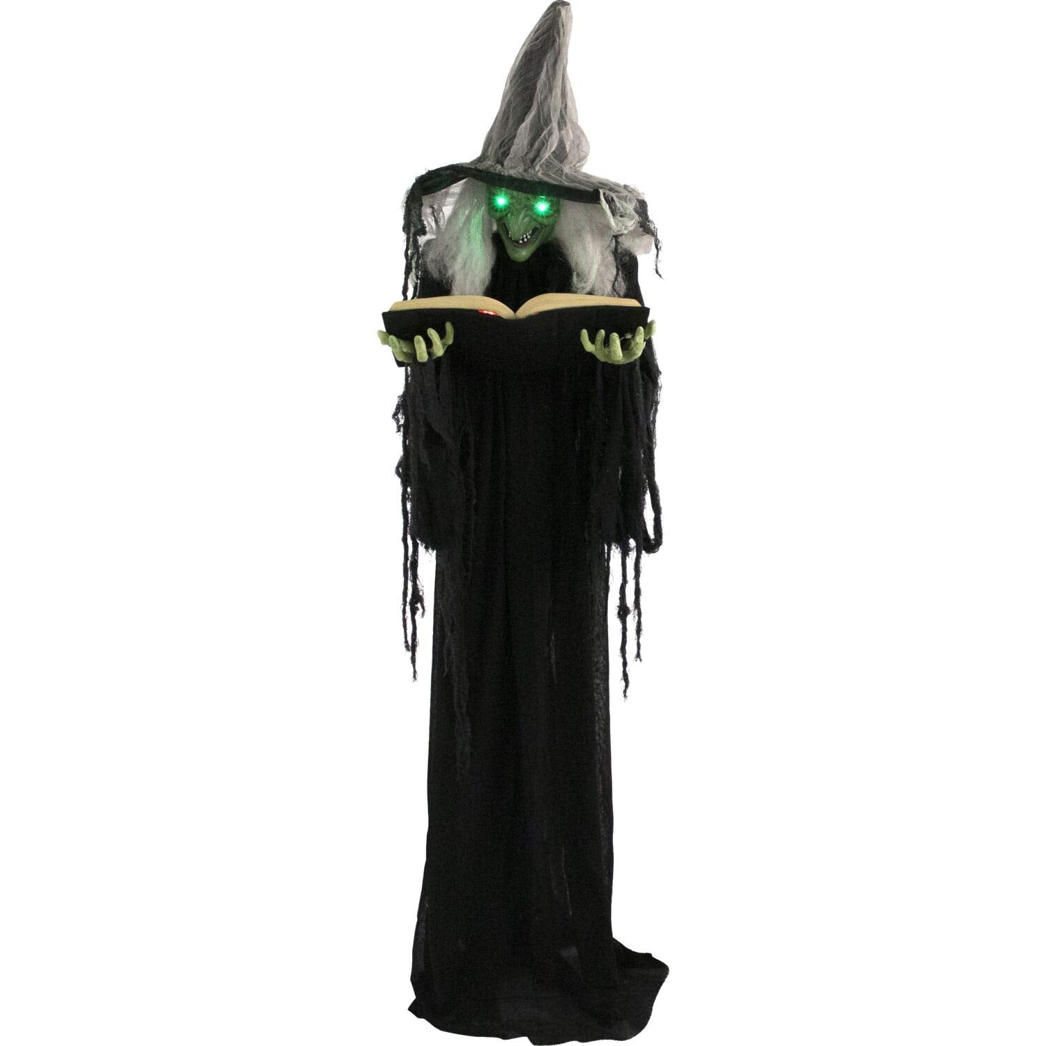 Haunted Hill Farm Life-Size Talking Witch Holding Spell Book, Halloween Animatronic with Touch Activated Lights and Sound, Poseable, Battery Operated Indoor or Covered Outdoor Halloween Decorations