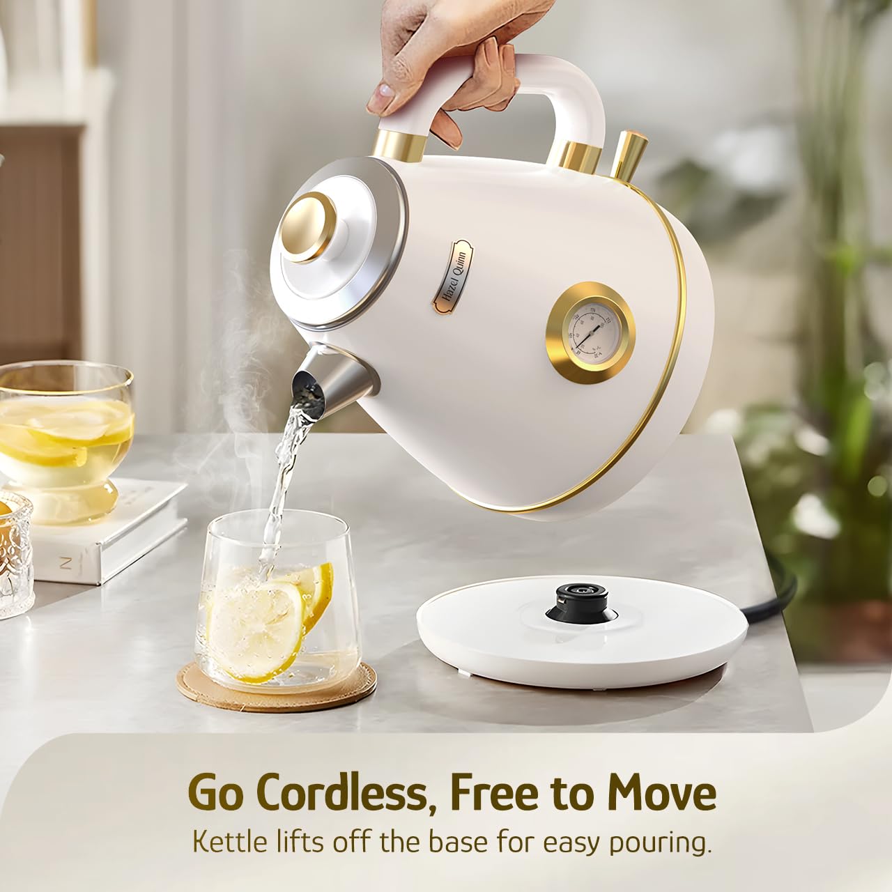 Hazel Quinn Retro Electric Kettle - 1.7 Liters / 57.5 Ounces Tea Kettle with Thermometer, All Stainless Steel, 1200 Watts Fast Boiling, BPA-free, Cordless, Automatic Shut Off - Pearl White