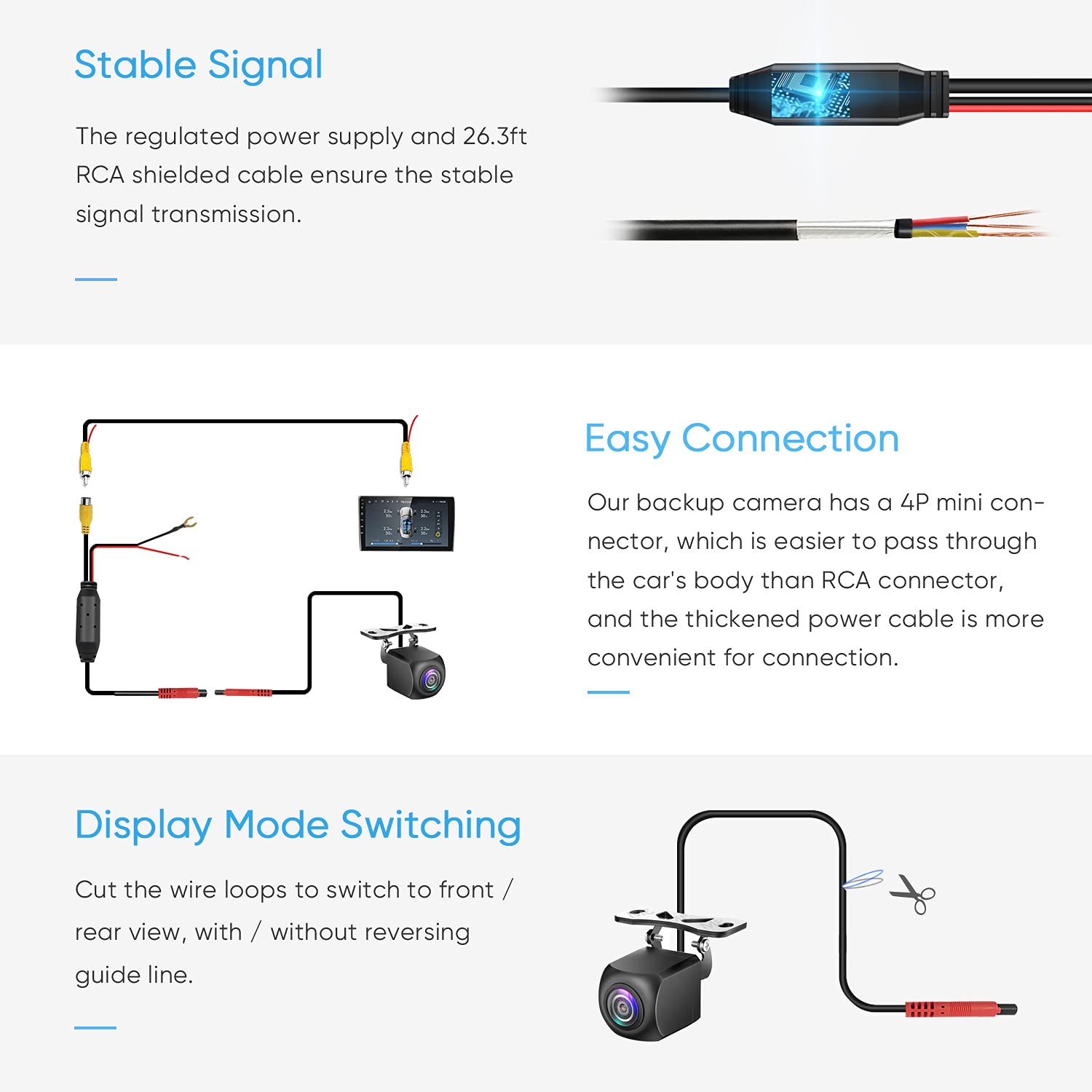 • 【Powerful Sensor Chip and Precise Lens】PixelMan car rear camera adopts superb 1/2.7 inch large sensor chip made in Japan,170 degree wide view angle fisheye lens,1.4mm aperture,plus the noise reduction and powerful image processing capability,all this ensure excellent images in various light environment. PixelMan rearview camera for car uses pure copper shielded cable which enhances the signal stability during long-distance transmission.Delivering a better experience.