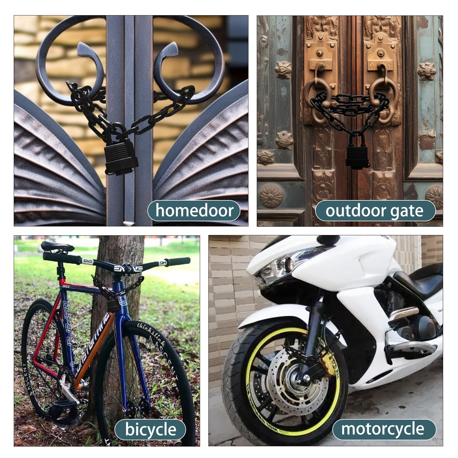 • Versatile: Stainless steel security chain padlocks are suitable for a variety of scenarios, such as warehouses, garages, sports equipment, farms, fences, doors and Windows, bicycles, motorcycles, camping trailers, trucks or electric scooters, wherever you want to provide security for items.