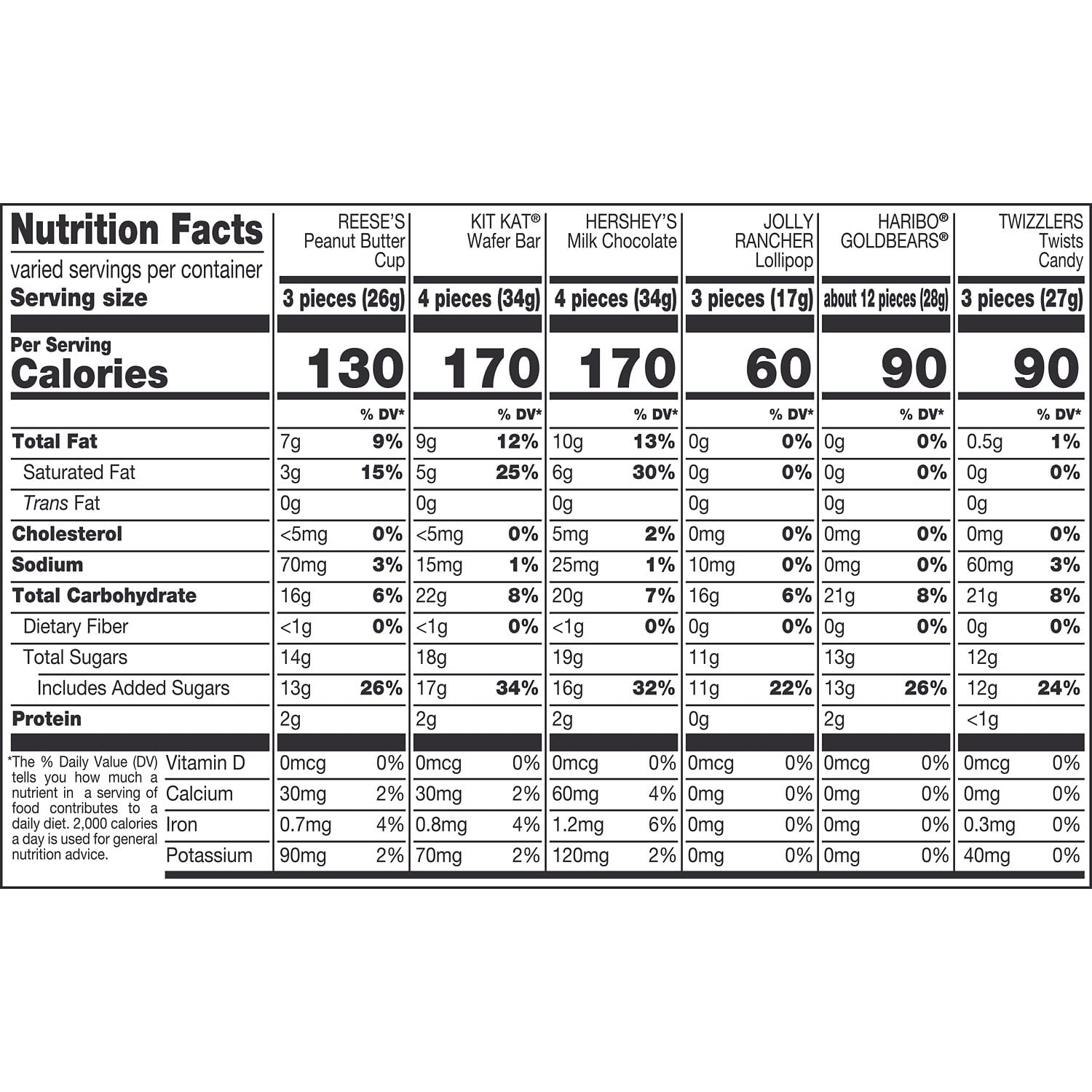 Details: Enjoy a delicious chocolatey or fruity treat anytime, anywhere with Hershey's assorted chocolate and fruit flavored Halloween candy in a variety bag, perfect for trick-or-treating or filling candy bowls. Offering six crowd pleasing favorites, this candy assortment is perfect for sharing with family, friends and Halloween night visitors. Whether you're a chocolate lover or prefer fruity sweets, there's something for everyone to enjoy. This assorted bag of miniatures candies contains TWIZZLERS Twists strawberry flavored candy, KIT KAT milk chocolate wafer candy bars, JOLLY RANCHER lollipops, HARIBO GOLDBEARS gummies, HERSHEY'S milk chocolate bars and REESE'S peanut butter cups.
