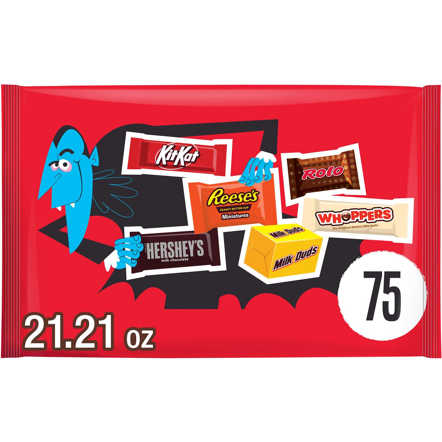 Details: Enjoy a delicious treat anytime and anywhere with an assorted bag of Hershey miniature candies, perfect for handing out as trick or treat candy or filling candy bowls at your Halloween party. Offering six crowd pleasing favorites, this Halloween candy bag is perfect for sharing with family, friends, teammates or co-workers. Take this variety candy bag into the office break room, pour some individually wrapped candies into your jar at home or take a bag to your next sports game to celebrate the win. This assorted bag of kosher candy includes REESE'S milk chocolate peanut butter cups candy, ROLO rich chocolate caramel candy, MILK DUDS chocolate caramel candy, WHOPPERS malted milk balls candy, KIT KAT milk chocolate wafer bars, and HERSHEY'S milk chocolate candy bars.