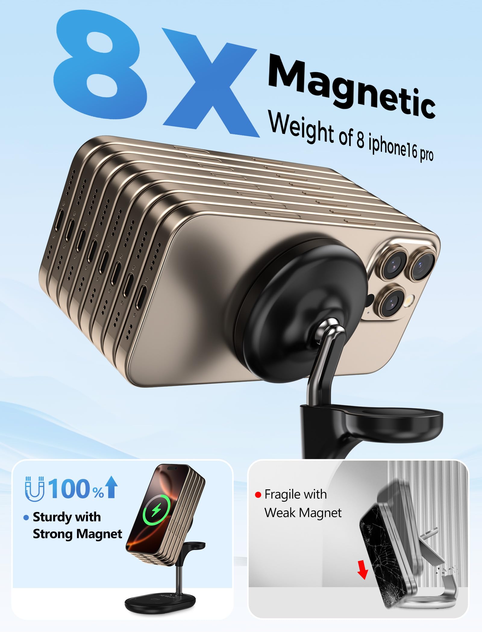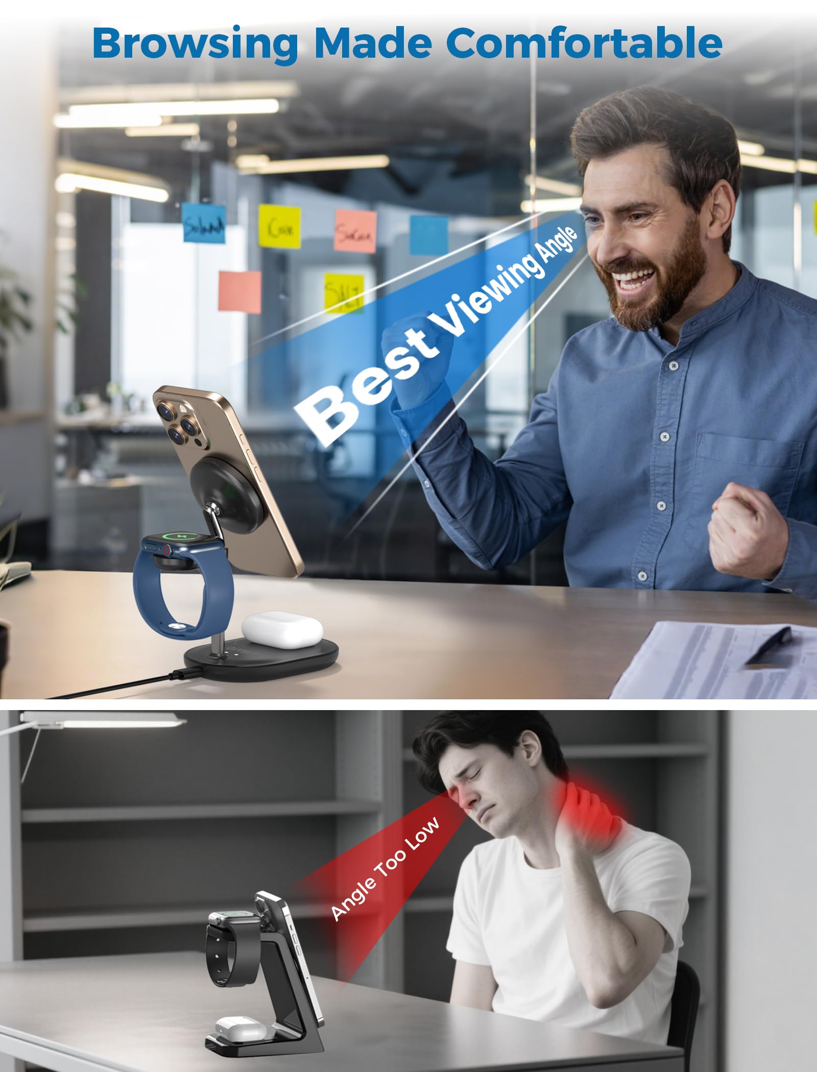 • โœ…๐€๐๐ฃ๐ฎ๐ฌ๐ญ๐š๐›๐ฅ๐ž ๐Œ๐š๐ -๐’๐š๐Ÿ๐ž ๐‚๐ก๐š๐ซ๐ ๐ž๐ซ ๐’๐ญ๐š๐ง๐ - Snap and Go! Powerful magnetic alignment brings the accurate sweet point and seamless charging to iPhone and iWatch without device drops! 40ยฐ adjustable viewing and 360ยฐ vertical or horizontal charging make watching videos and checking the information received ever so handy.