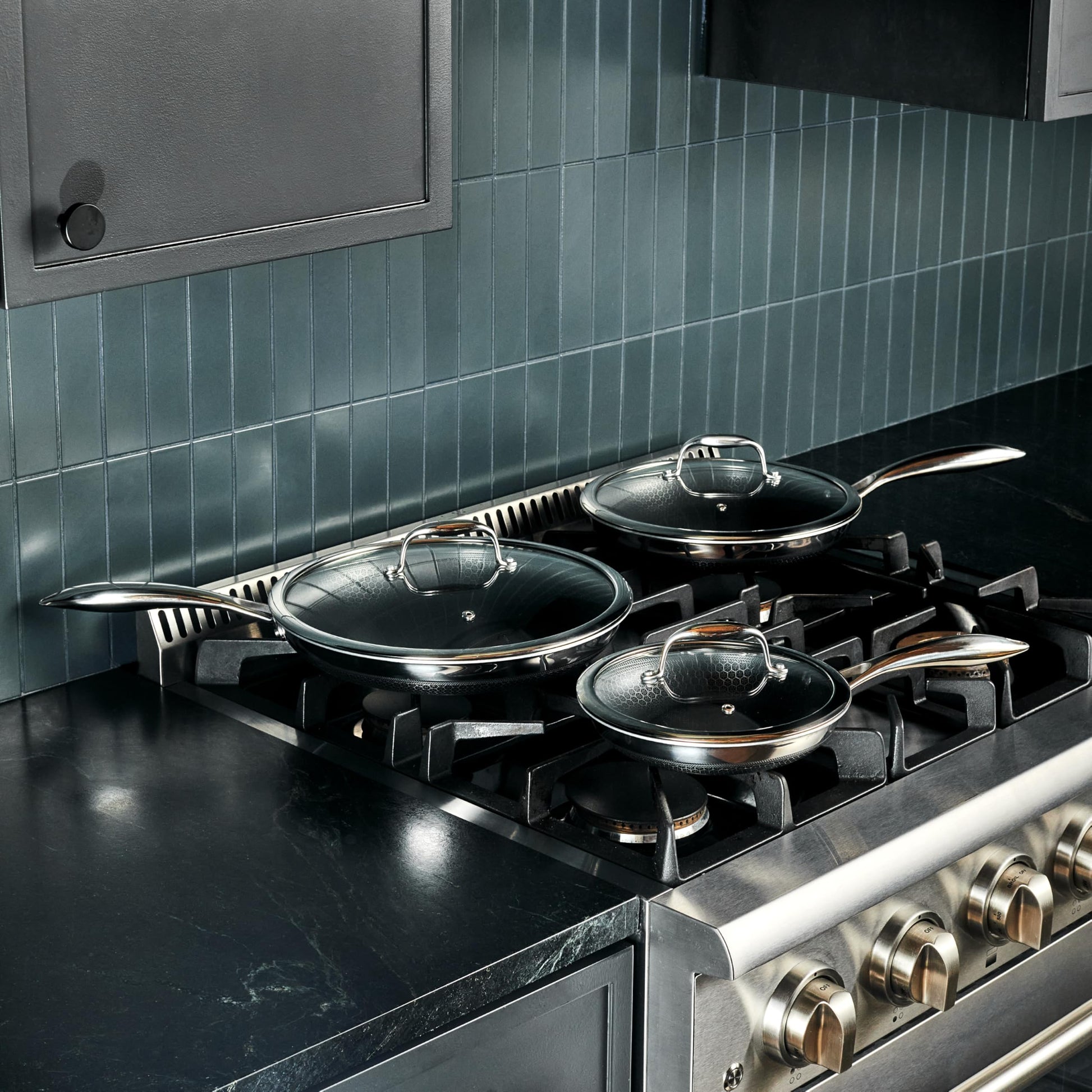 HexClad Hybrid Nonstick 6-Piece Fry Pan Set, 8, 10, and 12-Inch Frying Pans with Tempered Glass Lids, Stay-Cool Handles, Dishwasher-Friendly, Induction Ready, Compatible with All Cooktops