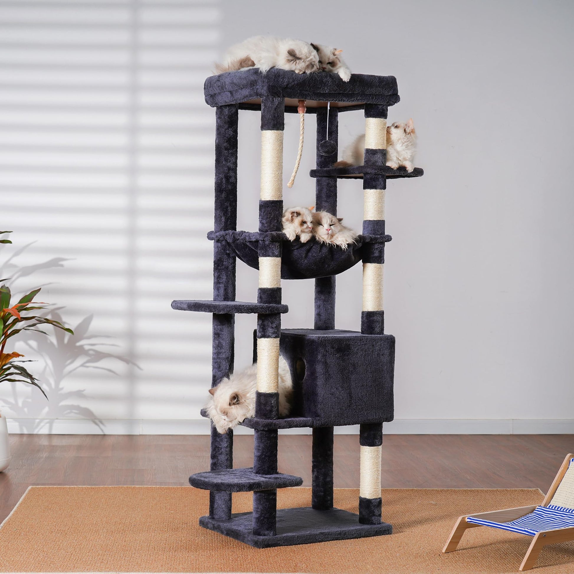 Heybly Cat Tree for Large Cats 20lbs Heavy Duty, 60 inches XXL Cat Tower for Indoor Cats, Multi-Level Furniture Condo with Big Padded Plush Perch, Cozy Basket, Smoky Gray HCT050G