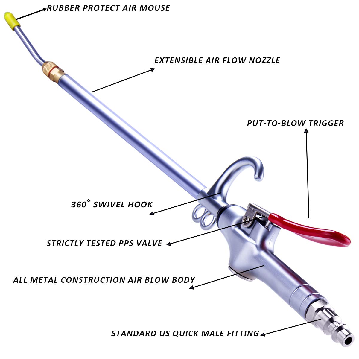 High Volume Powerful Industrial Air Blow Gun, 17-26 Inch Extensible Stainless Steel Air Flow Nozzle, Pneumatic Air Compressor Accessories Tool, Extended Dust Air Blower Gun with 360 Degree Swivel Hook
