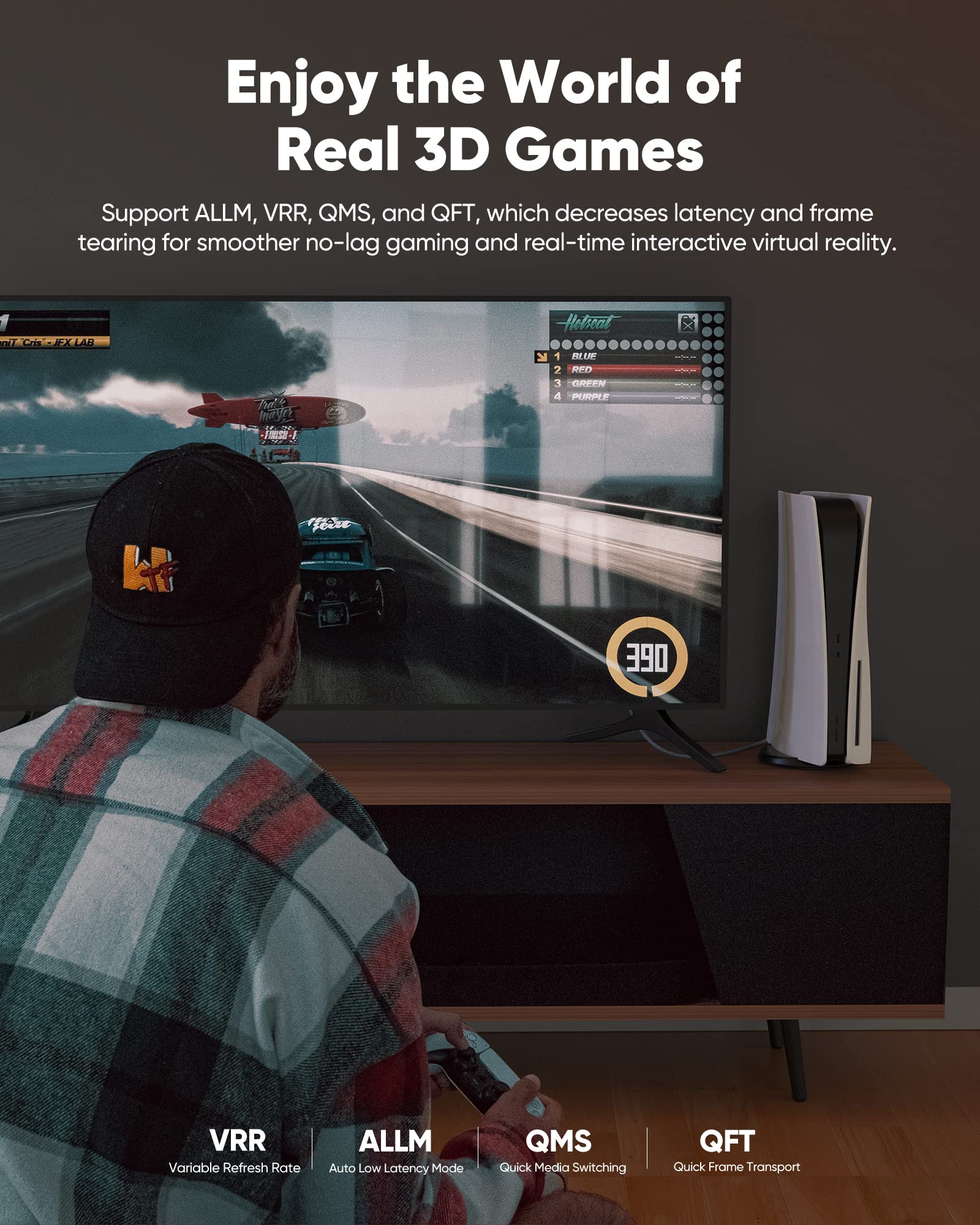 • For Game Enthusiasts: This 8K Ultra High Speed HDMI Cable can achieve a super smooth picture of 4K@120HZ. Its latest game mode supports variable refresh rate, maximizes the value of the graphics card and CPU to obtain a smoother and more detailed picture.
