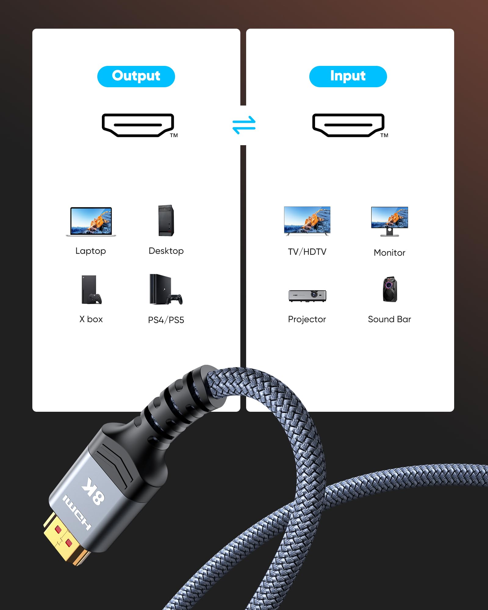 Highwings 8K@60 HDMI Cable 10FT/3M, 48Gbps 2.1 High Speed HDMI Braided Nylon 4K120 144Hz RTX 3090 eARC HDR10 4:4:4 HDCP 2.2&2.3 Compatible for PS5, PS4, UHD TV and PC