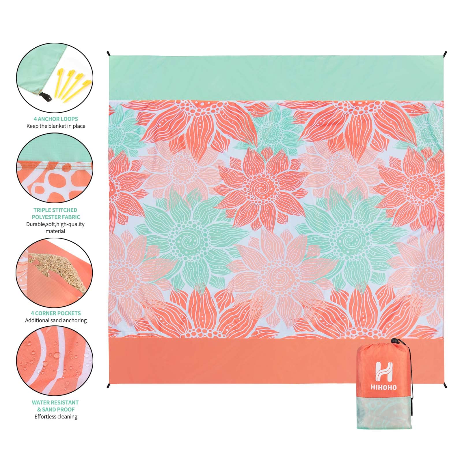 • 🌴【Sand proof & Water resistant】This quick-drying, durable travel blanket are made of nylon. You can just shake the beach mat to remove sand or other debris. The sand pad has 4 pockets at each corner, so you can fix it on the beach by filling the side pockets with stone, sand, or using the included anchor.
