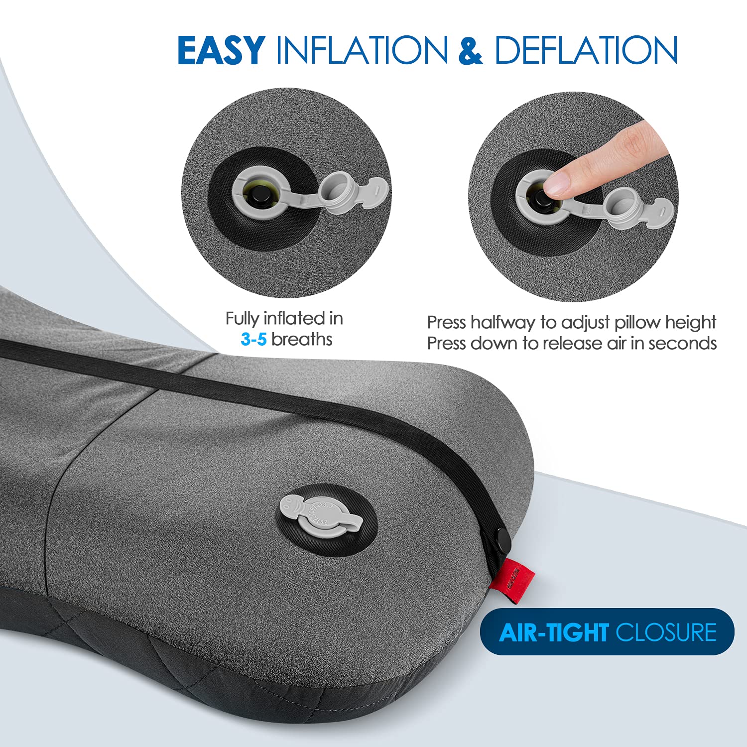 • π——π—˜π—§π—”π—œπ—Ÿπ—¦ π——π—˜π—¦π—œπ—šπ—‘π—˜π—— 𝗙𝗒π—₯ 𝗬𝗒𝗨π—₯ π—–π—’π—‘π—©π—˜π—‘π—œπ—˜π—‘π—–π—˜ - With unique ONE-CLICK VALVE, our travel pillow is fully inflated in only a few breaths. Simply click the button and the valve lets air in, without losing air when you take another breath. Click the button again and the hiking pillow deflates just in seconds. Enjoy your sound sleep through night thanks to the DETACHABLE ELASTIC STRAP on the back of pillow which keeps your backpacking pillow in place on e.g. sleeping pads.