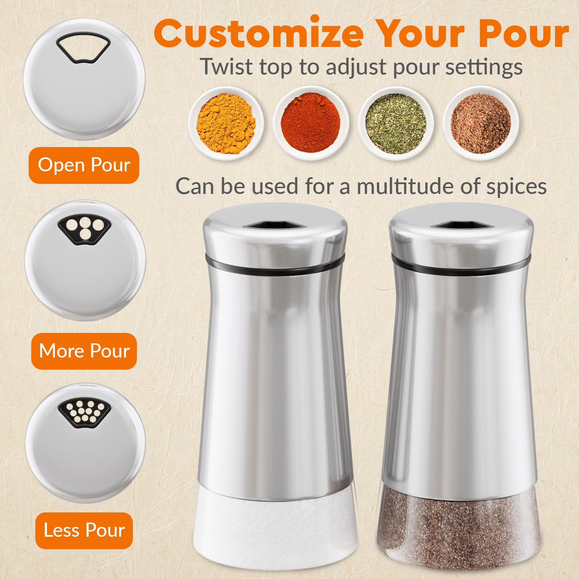 • Multiple Adjustable Pour Hole Settings: 2 settings control the amount of salt & pepper added to your meal, 1 setting allows for pouring salt in large quantity, and 1 setting seals your salt, pepper or spices keeping them fresh for the next use.