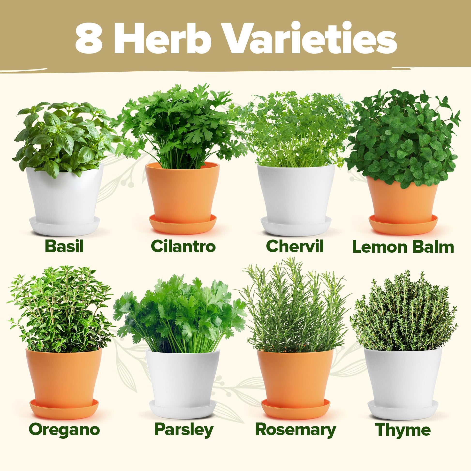 • ALL-IN-ONE KIT FOR SUCCESS. Includes 8 premium herb seed packs, 8 soil pellets, 8 reusable pots with trays, 8 wooden plant markers, a nutrition pack, and a detailed grow guide. EASY SUCCESS. Hermetically sealed seed envelopes stay viable for up to 2 years. Non-GMO seeds and a clear guide ensure a high germination rate and reliable results, even for beginners. Everything to create a vibrant indoor herb garden year-round β€” a DIY cooking set and culinary present for family.