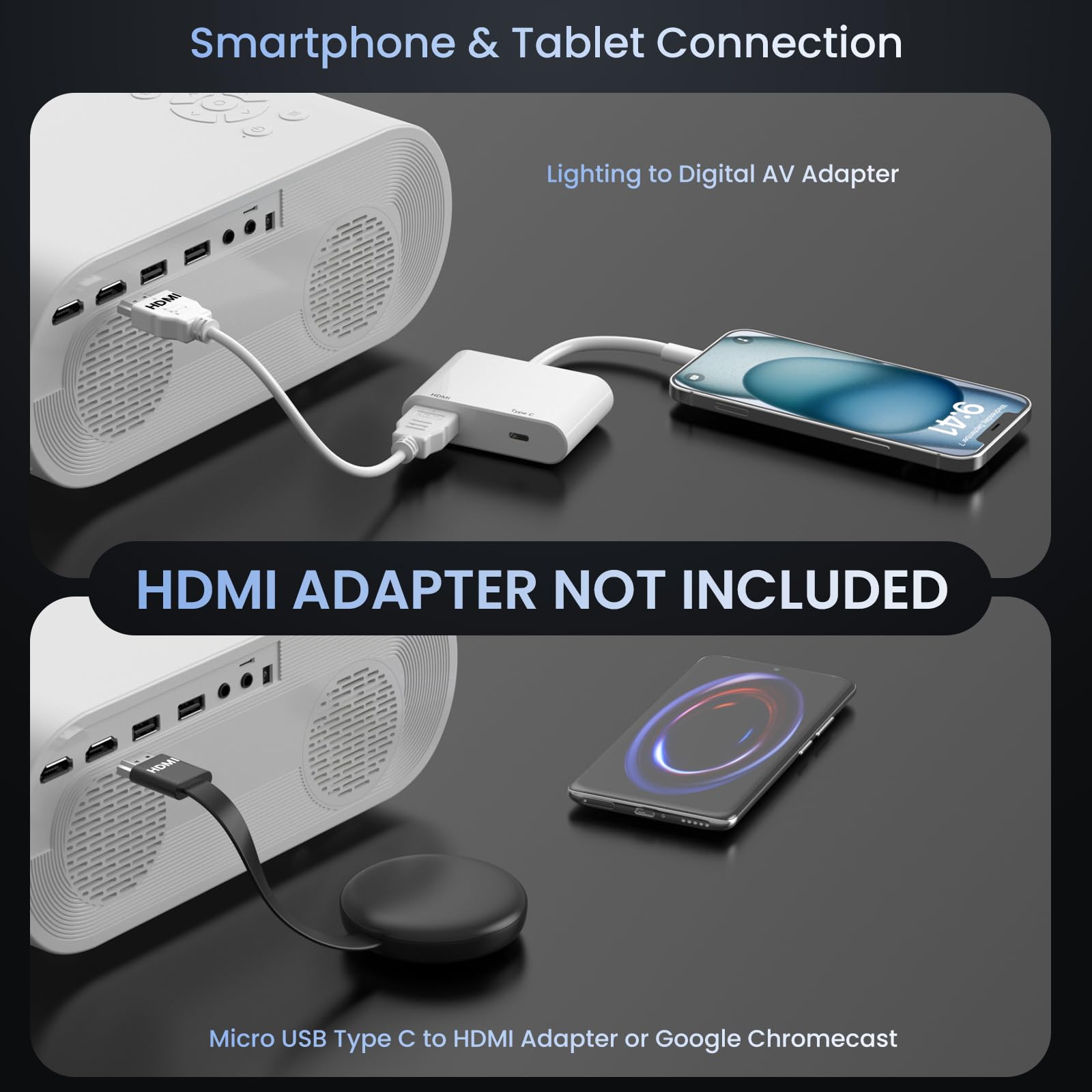 • 【Phone Projector with Wide Compatibility】:Equipped with HDMI, AV, USB, 3.5mm headphone interface, the smart projector is compatible with TV Box, TV Stick, Laptops, Tablets, USB Flash Drive, etc. it's compairble to multiple devices to meet most daily home theater requirements—Home Theater, Video Game, Party, Apartment