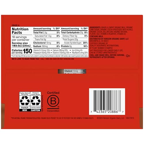 • Organic Milk on the Go: Eighteen 8 fl oz Horizon Organic Shelf Stable 1% Lowfat Chocolate Milk Boxes offer delicious chocolate milk made with organic cocoa