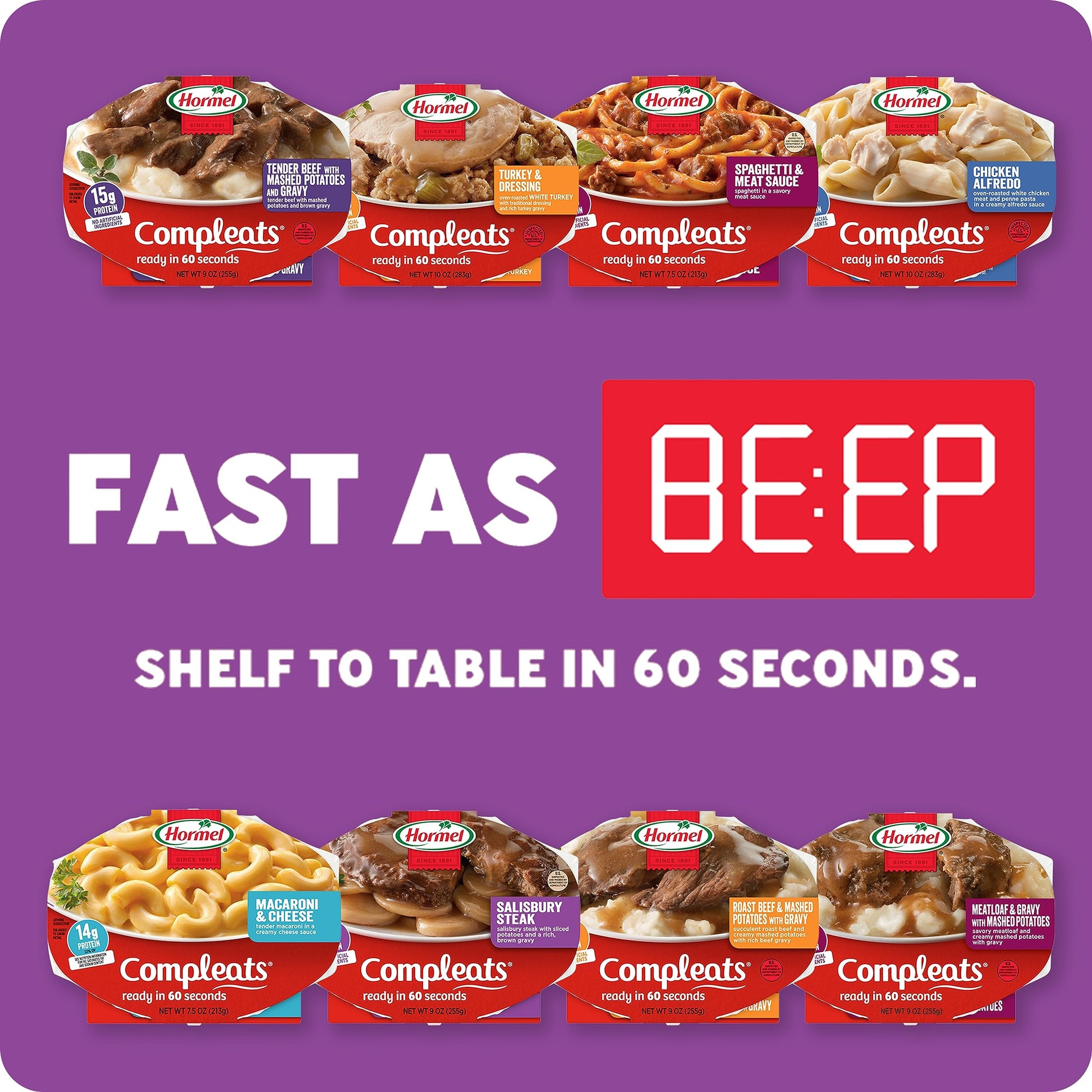 • HORMEL COMPLEATS products: On the job or at home after a long day, HORMEL COMPLEATS microwavable trays meet you where you're at; satisfying lunch or dinner that is ready in 60 seconds with no prep, clean-up, or freezer required