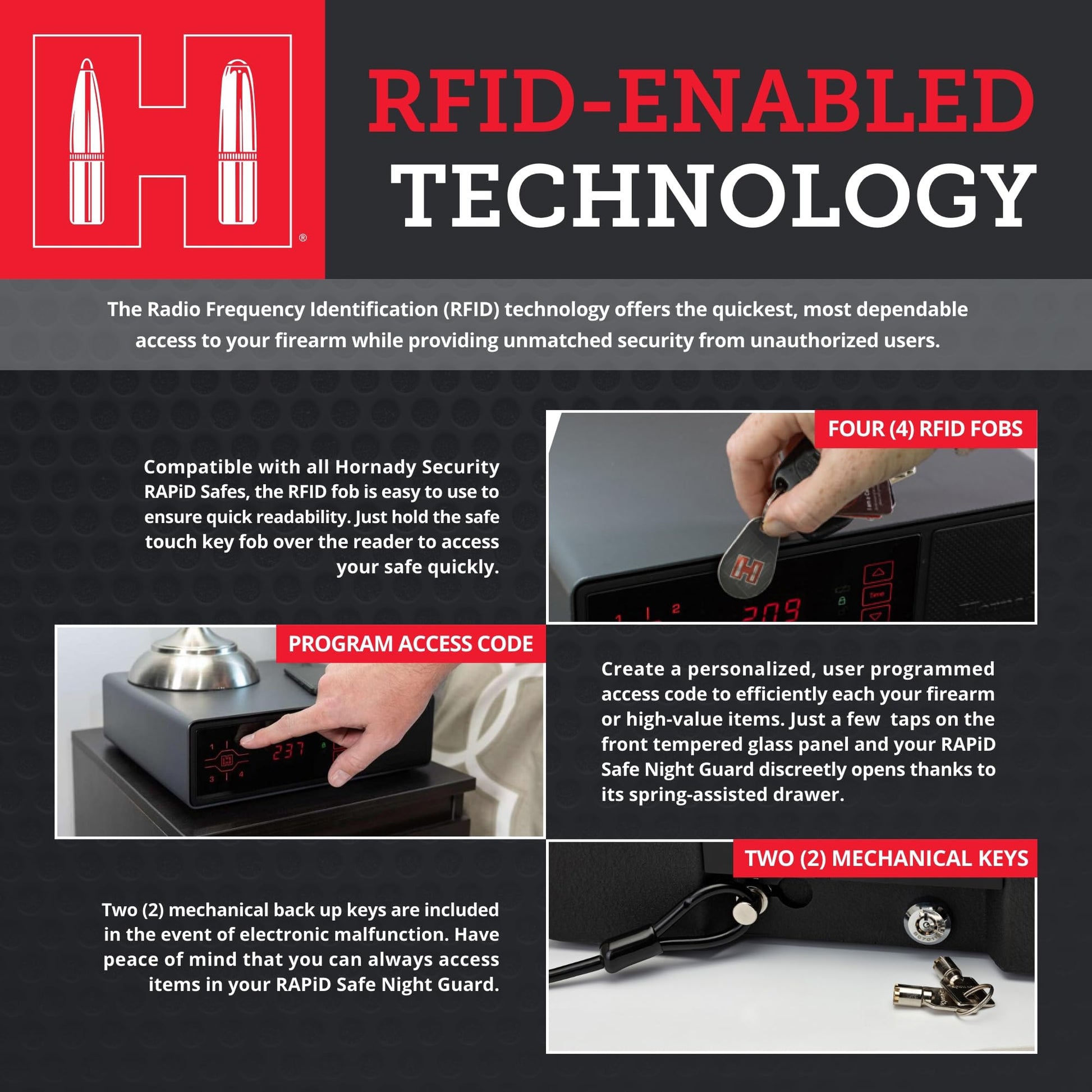 • Quick Access Gun Safe - This Hornady gun safe uses the patented RFID technology to unlocks safes faster than keypads and biometric gun safe for handgun. Four included RFID tags can be selectively programmed to open this safe and any other RFID gun safe you own.