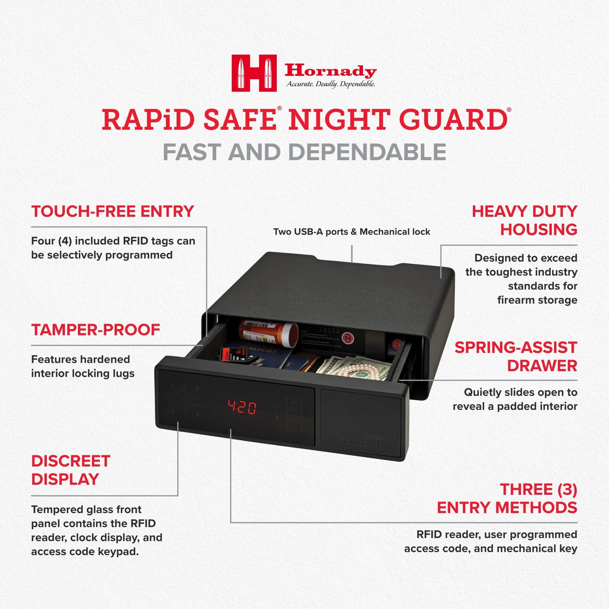 Hornady Rapid Safe Night Guard – Nightstand Gun Safe with RFID Reader, Clock, USB Ports – RFID Safe for Fast, Multiple Method Entry – Includes Rapid Safe, 3 Methods of Entry and Security Cable