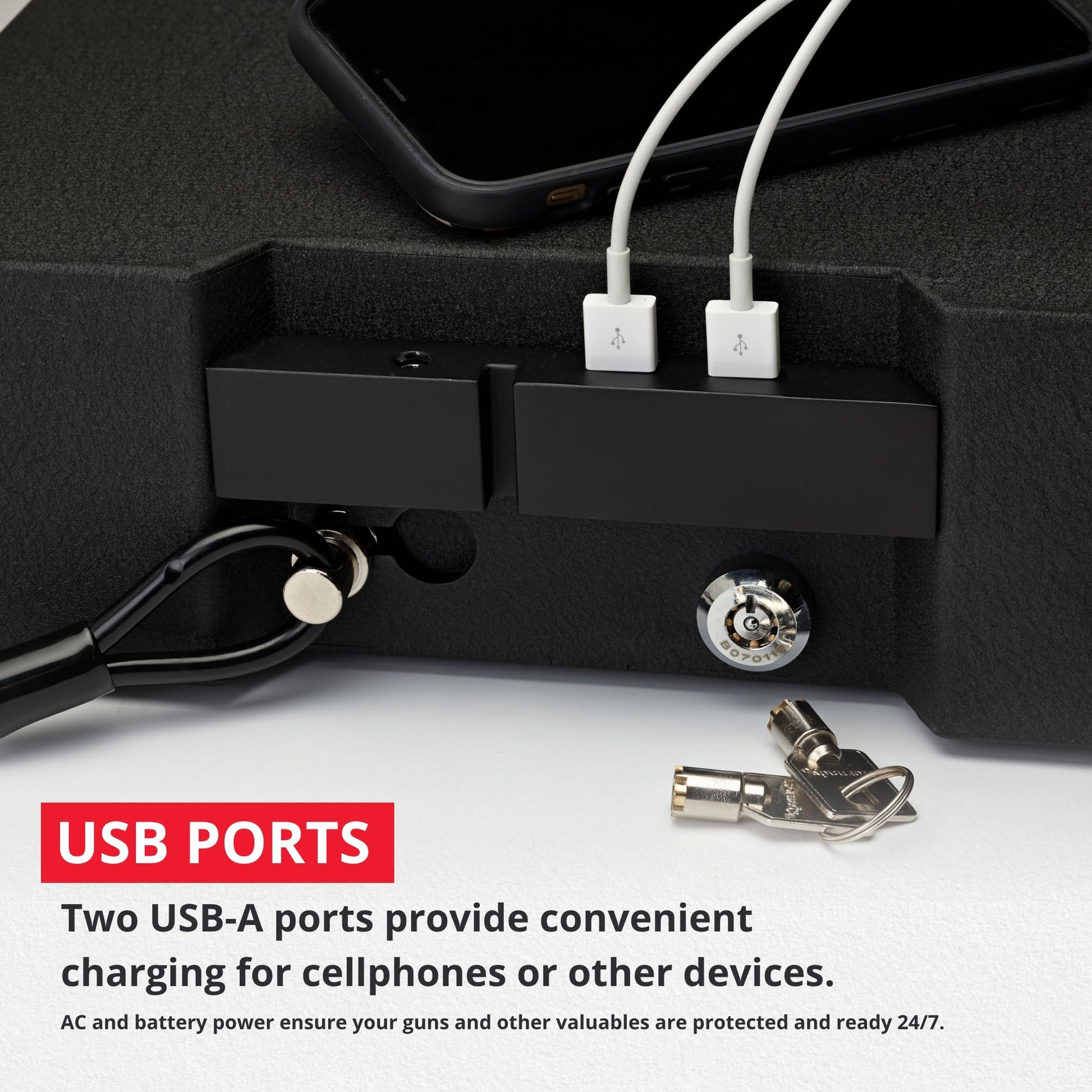 • Sizing and Specifications – Item 98215. Exterior: 3' x 12' x 10.5', Interior: 2.2' x 9.2' x 6.9'. Accommodates most full-sized handguns and/or valuables. 2 USB-A ports for charging devices