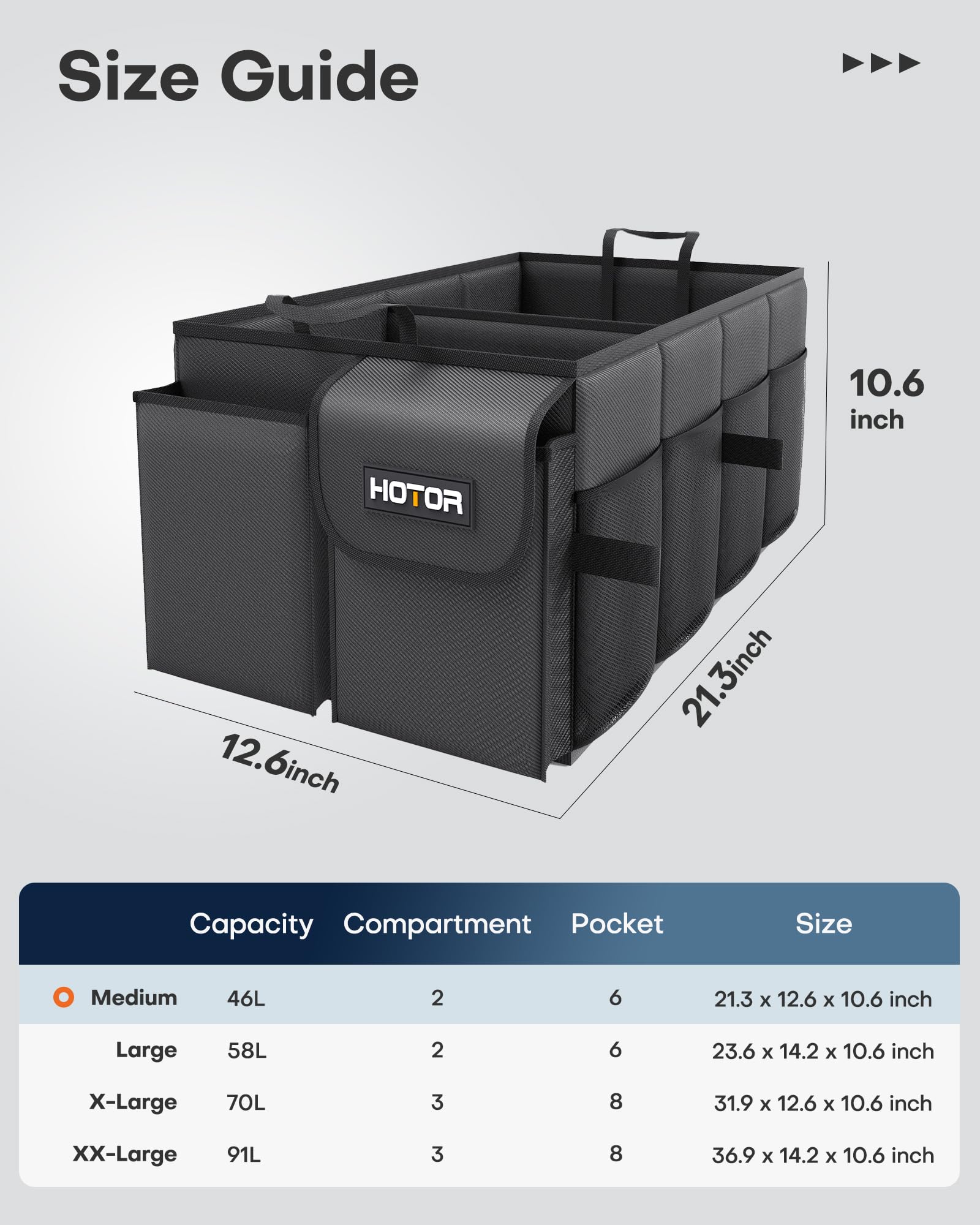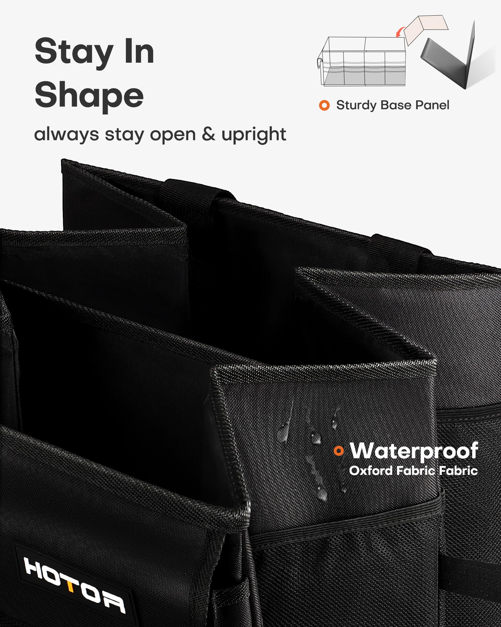 • CONVENIENT ACCESS: HOTOR car trunk organizer for SUV is equipped with 2 compartments and 6 stretchy mesh pockets to make items easy to see and grab when needed. No more digging around a messy trunk to find what you need. Just grab and go.