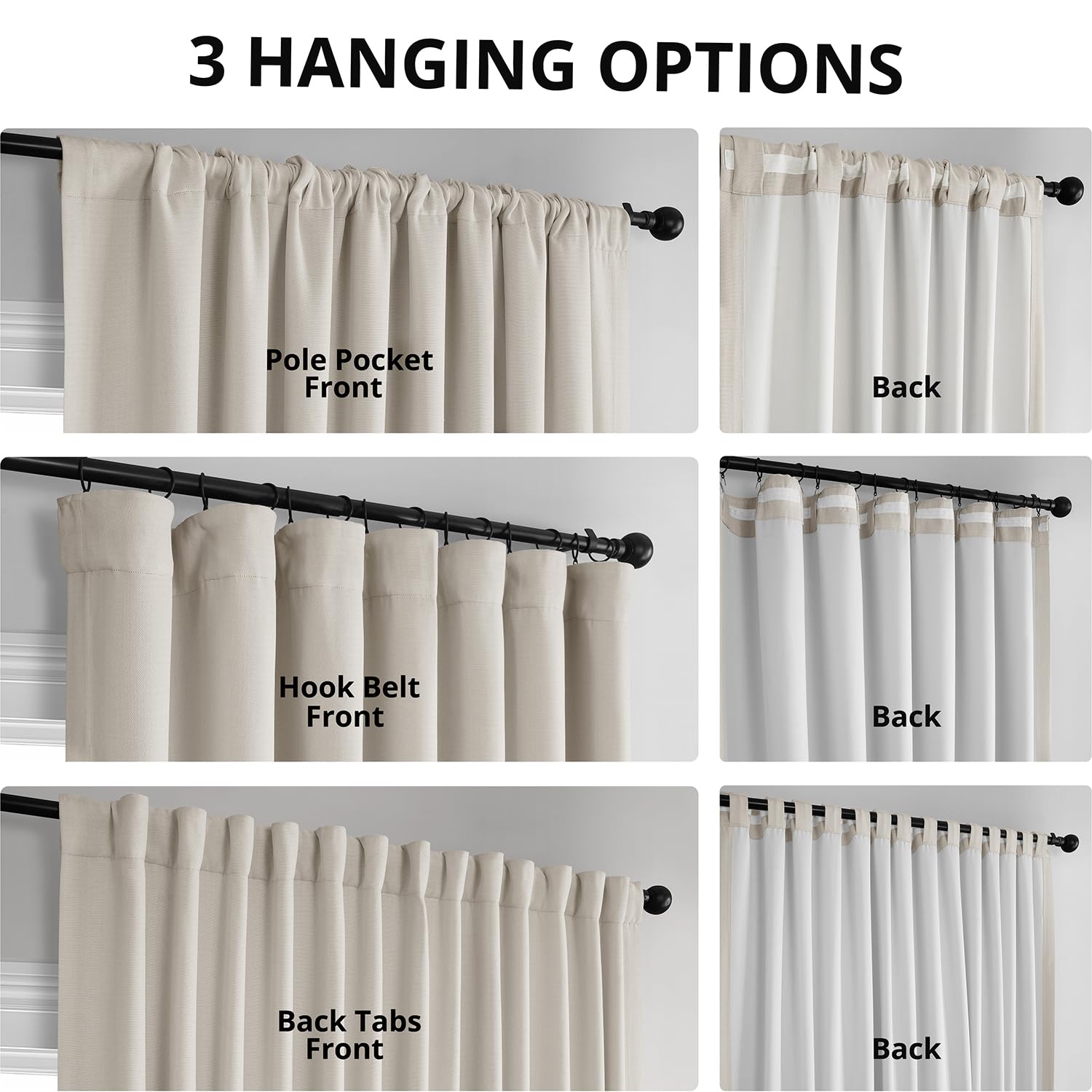 • USER APPLICATION or APPLICATION INSTRUCTIONS - These linen curtains for living rooms and bedrooms can be hanged as per choice in 3 different settings as preferred to compliment the surroundings and furniture settings: Curtain panels can be sheered on a rod using the pocket Hang with back tabs for a fixed ripple look Attached to rings using the belt and drapery pins NOTE: Hooks Not Included in the package