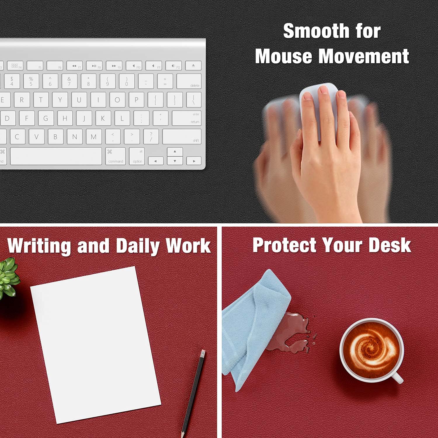- Dual Side and 2 Colors: Premium leather used for the back and surface sides, both side will provide you ultimate comfort while moving mouse. 2 in 1 color and reversible, just turn it over and you can get another style desk pad to match with any scenes